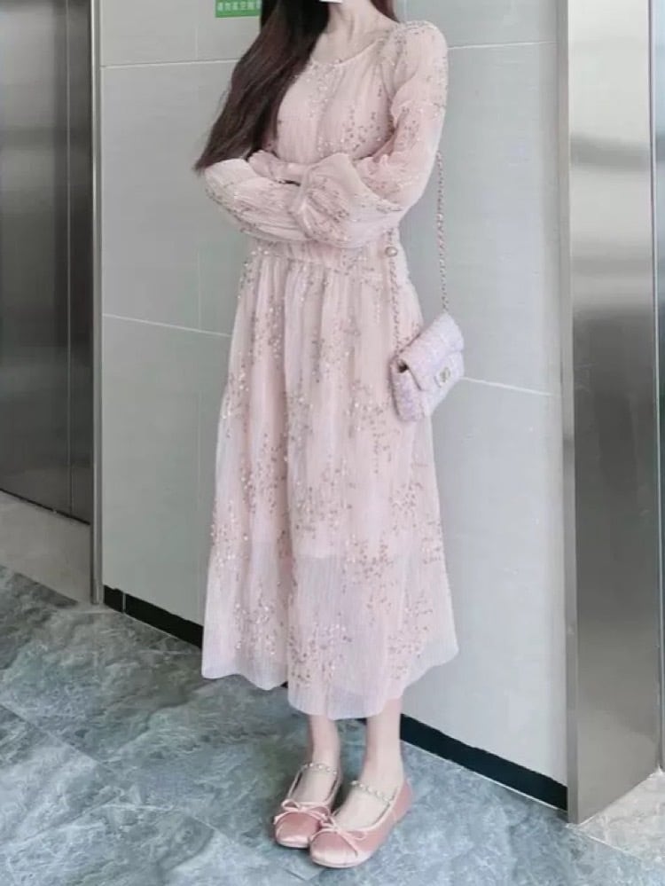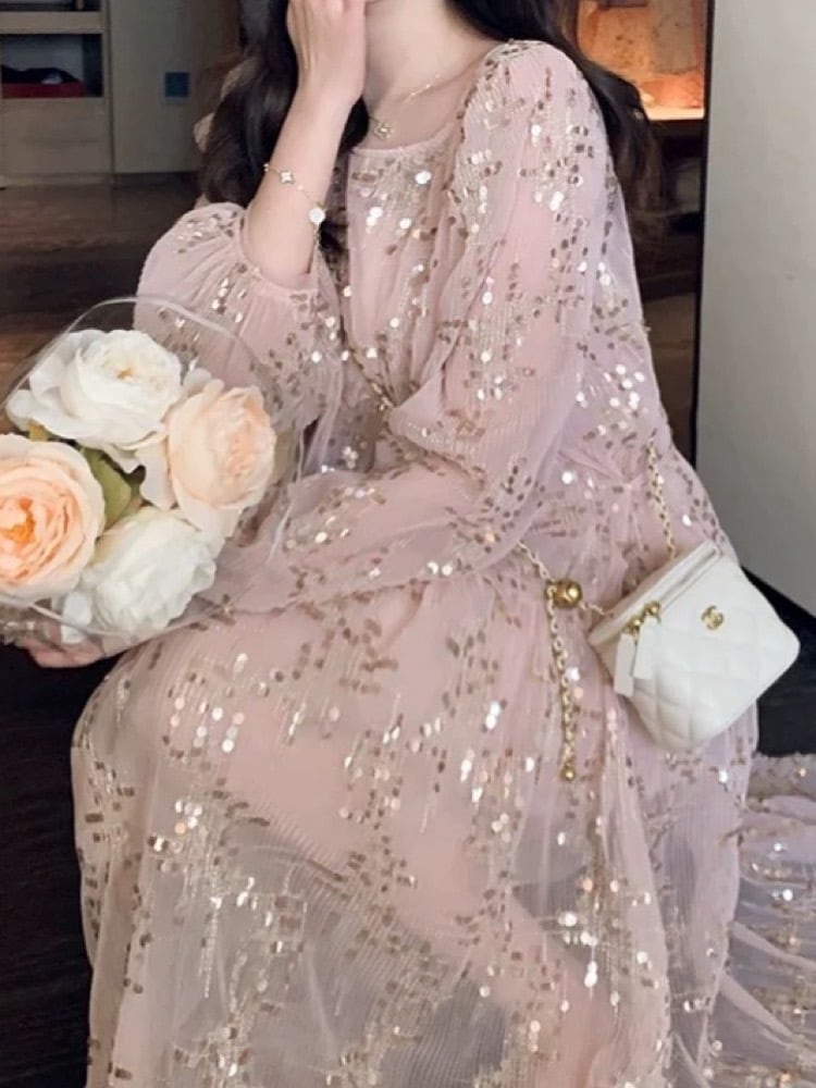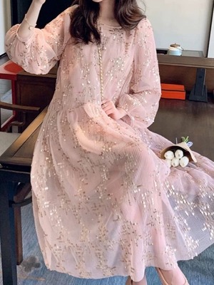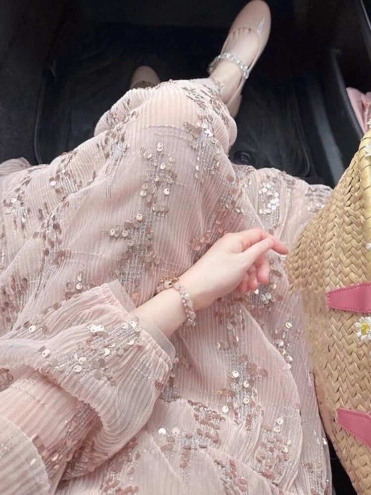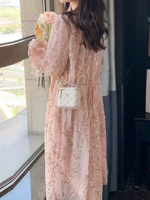 淡いピンクにスパンコールを散りばめた華やかなロングワンピース。