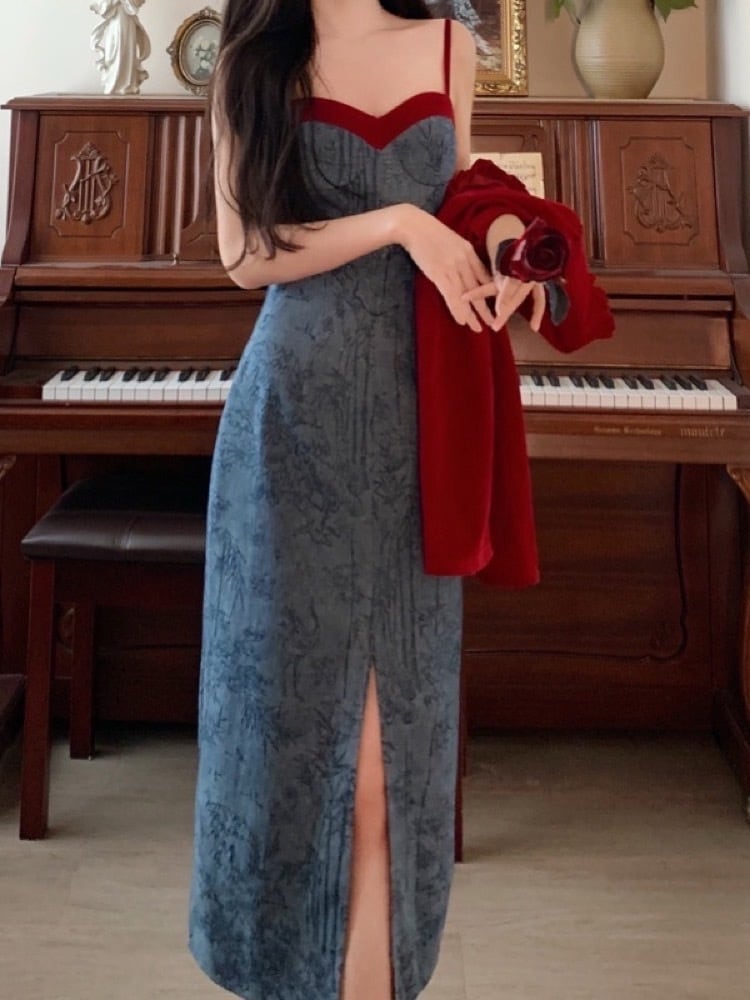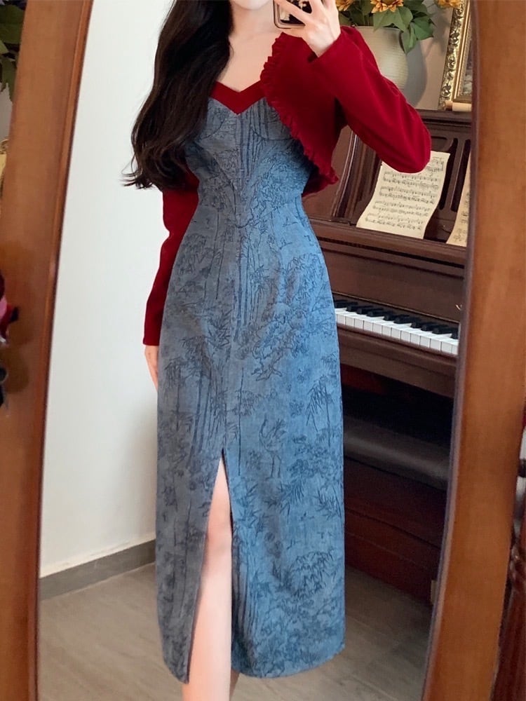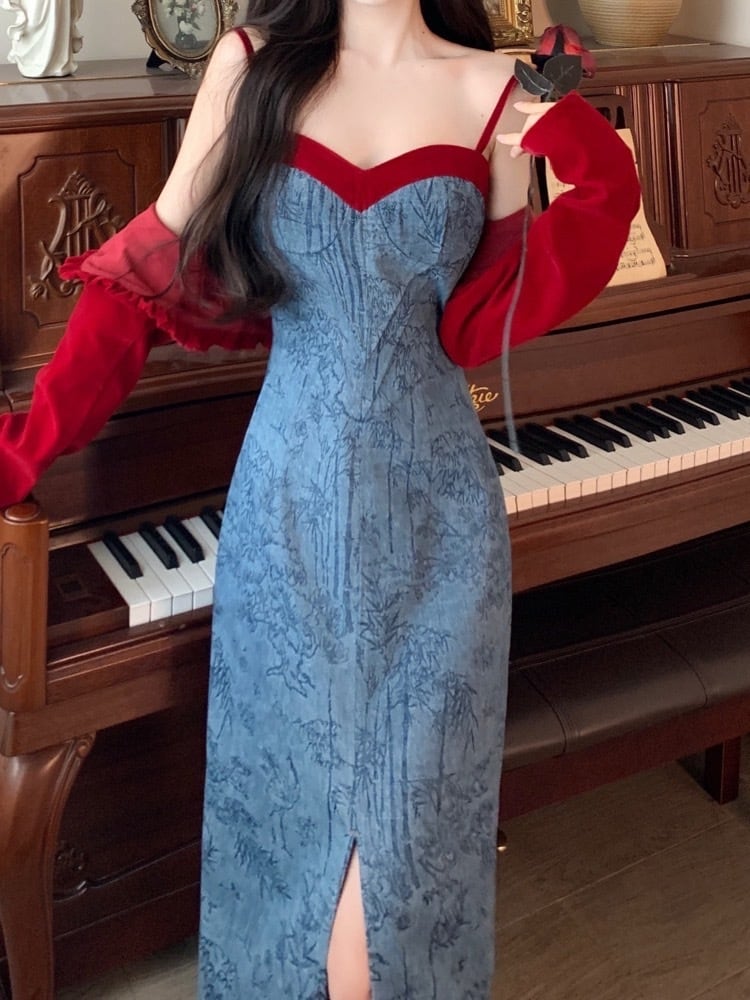 デニム素材のキャミワンピと赤カーディガンの2点セット。