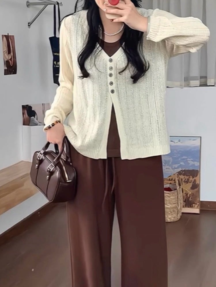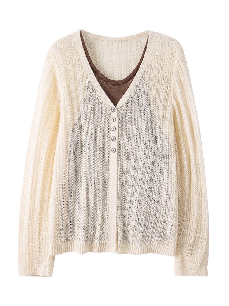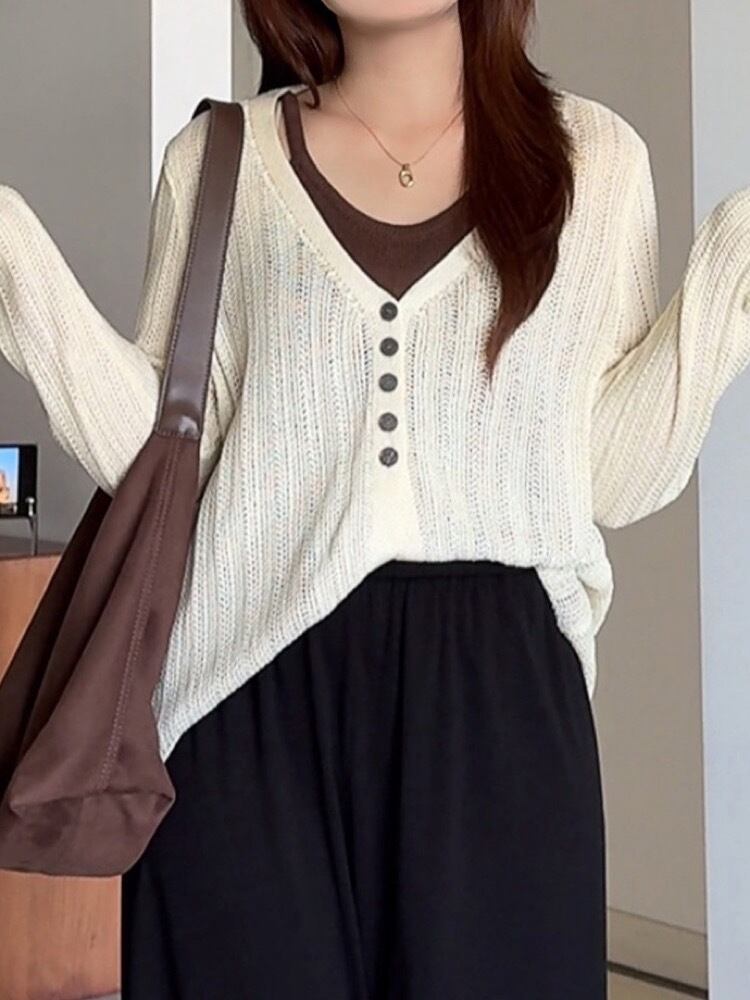 ゆるっと羽織って大人シンプル 重ね着風ナチュラルカーディガン Vネック オフィス 通勤 体型カバー 大きいサイズ 韓国 CH10951
