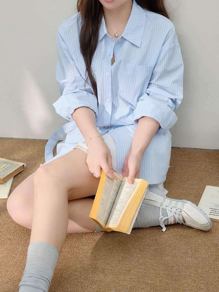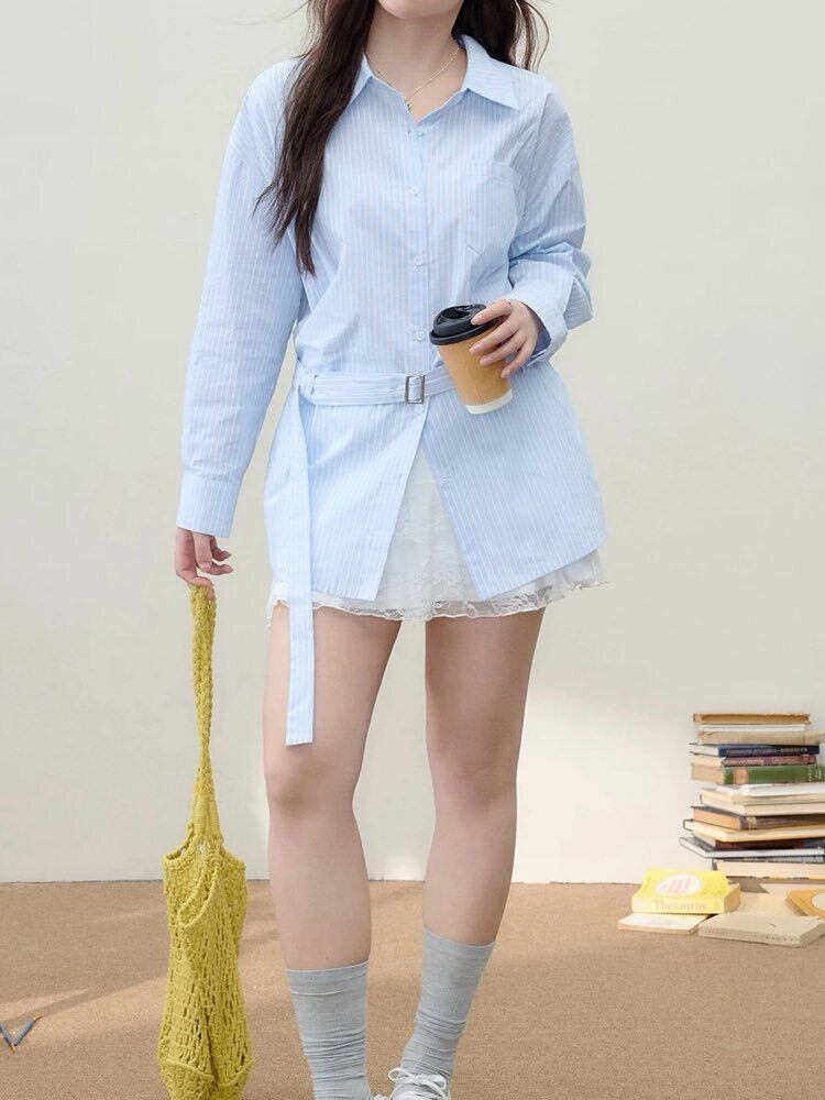 オフィスも休日もシンプルに華やぐ ウエストバックルストライプシャツ 長袖 ストライプ柄 お洒落 大人可愛い 上品 くびれ オフィス カジュアル きれいめ おでかけ 細見え 体型カバー 大きいサイズ 韓国 CH10955