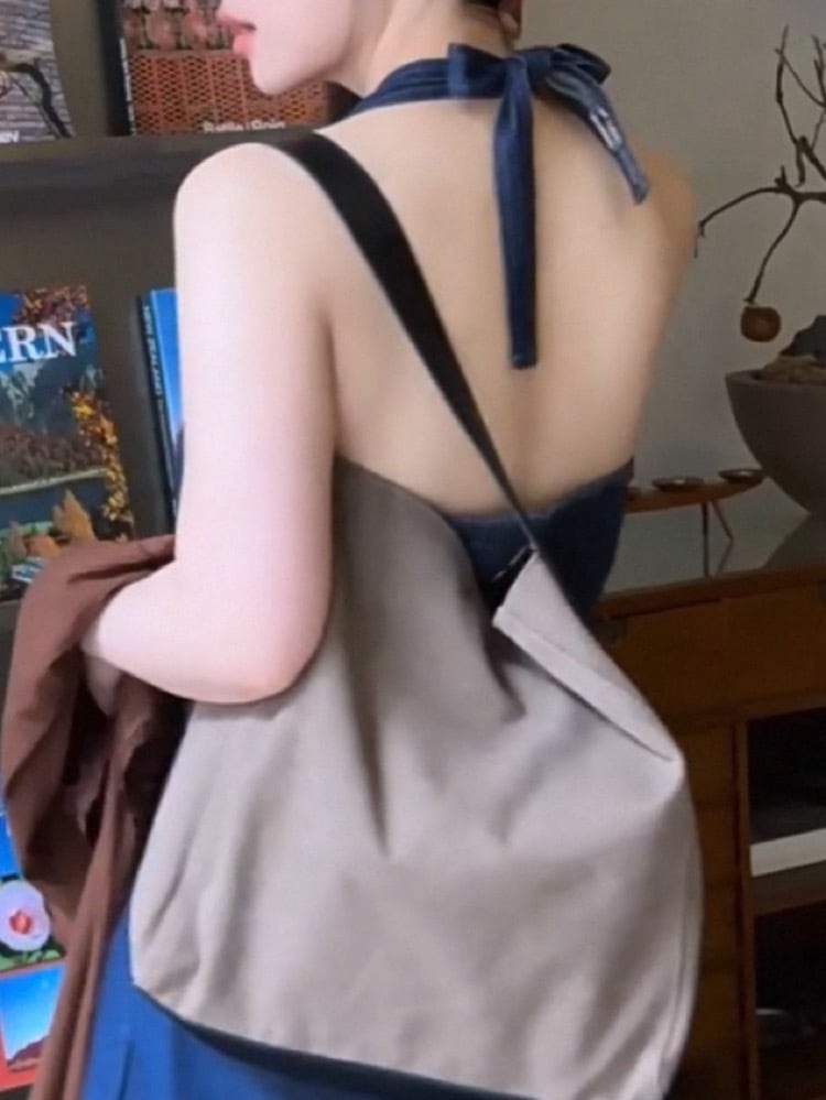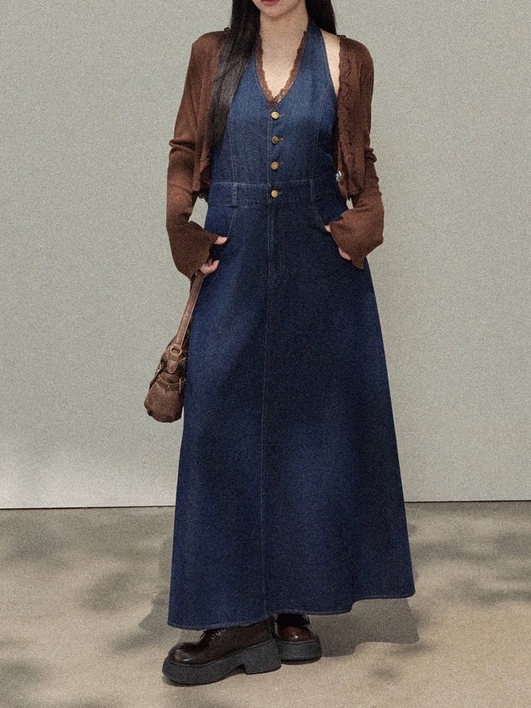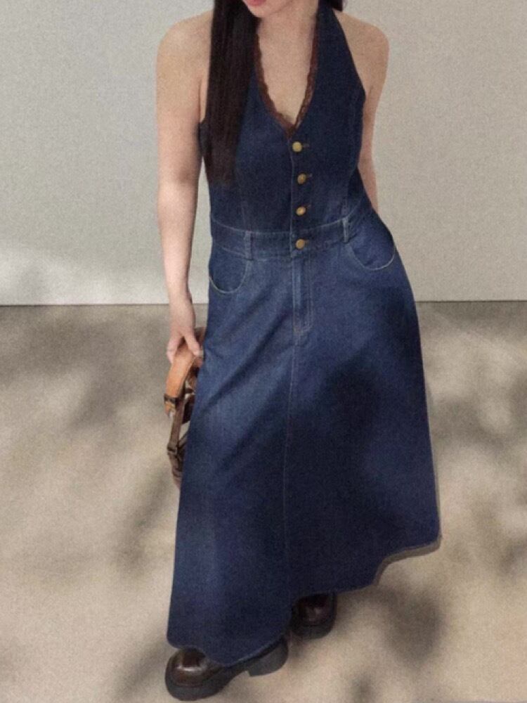 深めのホルターネックが女性らしさを引き立てるデニムワンピース。