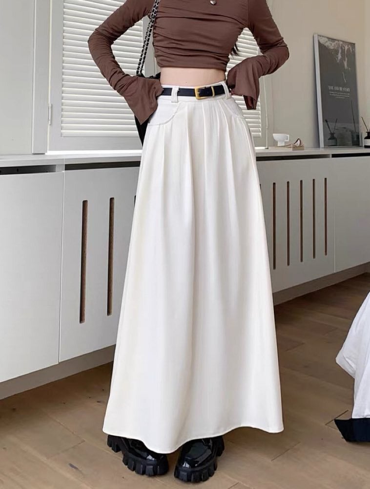 ロング丈で気になる腰まわりや太ももをナチュラルにカバーしつつ、揺れる裾が歩くたびに女性らしい雰囲気を演出♪