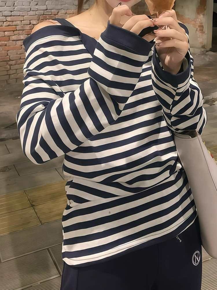 ボーダーで魅せる抜け感カジュアル オープンショルダーボーダーロンT 長袖 ボーダー お洒落 こなれ感 カジュアル 大人 肌見せ ヘルシー クール リラクシー 体型カバー 大きいサイズ 韓国 CH10970