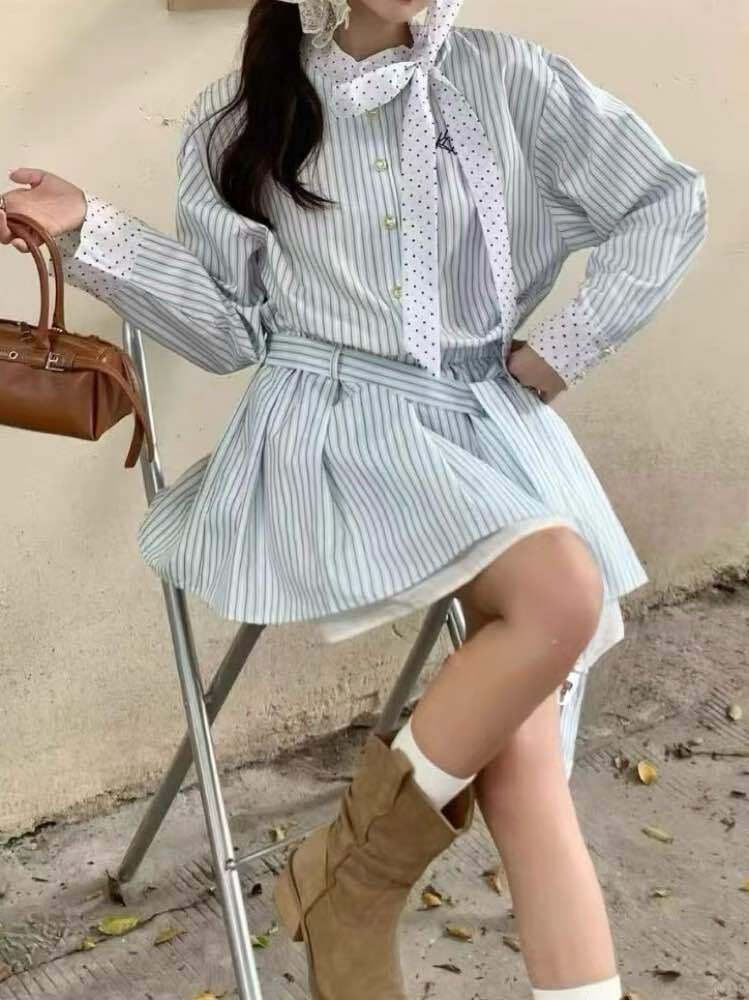 こだわりのディテールで甘さと爽やかを両立 ストライプドットノーカラーシャツワンピース 長袖 ストライプ ドット リボン おしゃれ 大人可愛い キュート 爽やか プリーツ 細見え くびれ 大きいサイズ 韓国 CH10988