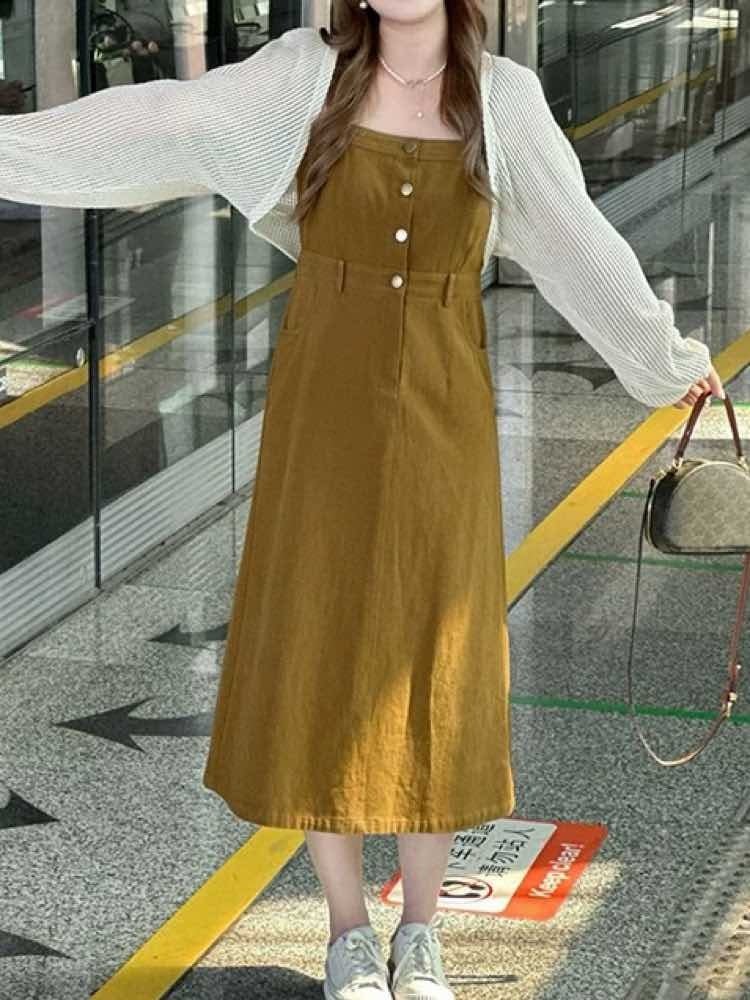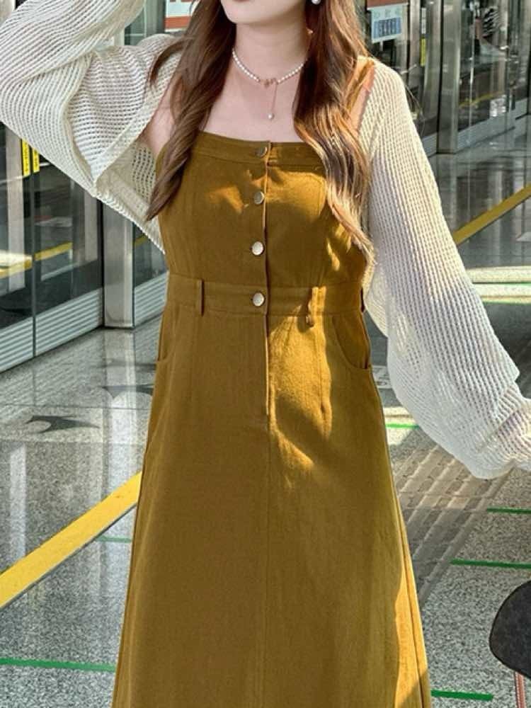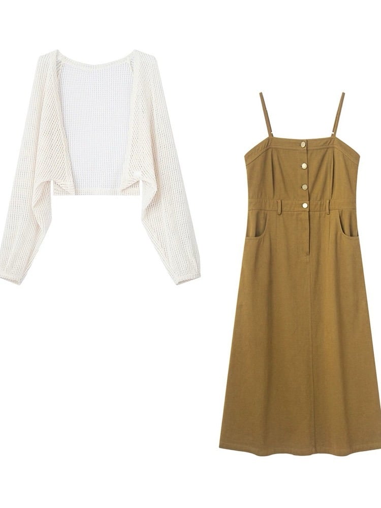 パパっと完成♪大人可愛いコーデ 透かし編みボレロ×フロントボタンジャンパースカート セット 大人可愛い おしゃれ シアー 透かし編み カーディガン 羽織り カジュアル スリット 着回し 体型カバー 大きいサイズ 韓国 CH10989