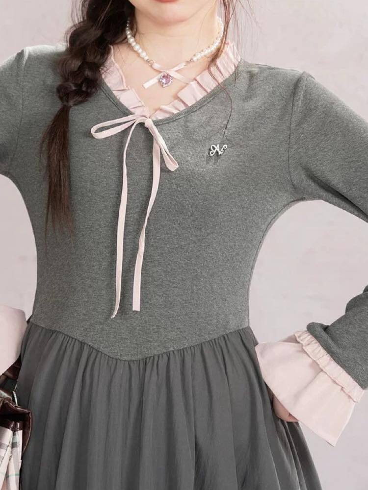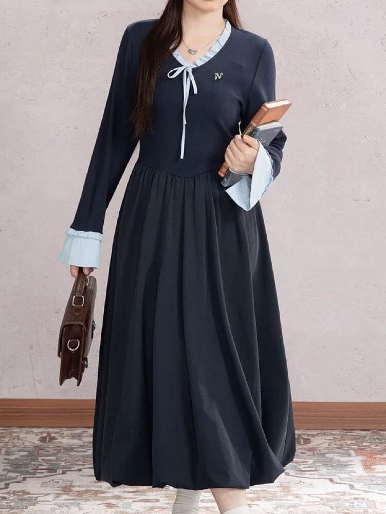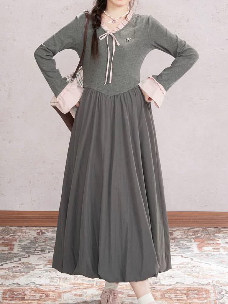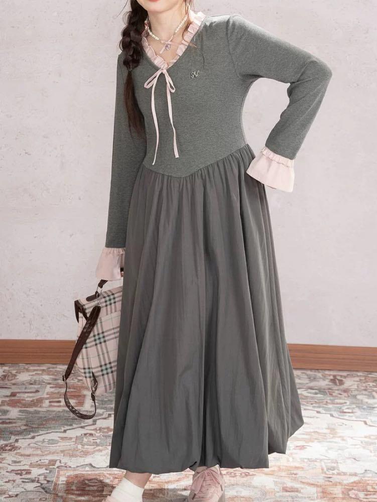きちんと感も可愛さも1枚で叶う 配色フリルロングバルーンワンピース おしゃれ リボン フリル 大人可愛い 上品 きれいめ カジュアル バイカラー ロング丈 異素材MIX 体型カバー 大きいサイズ 韓国 CH10990