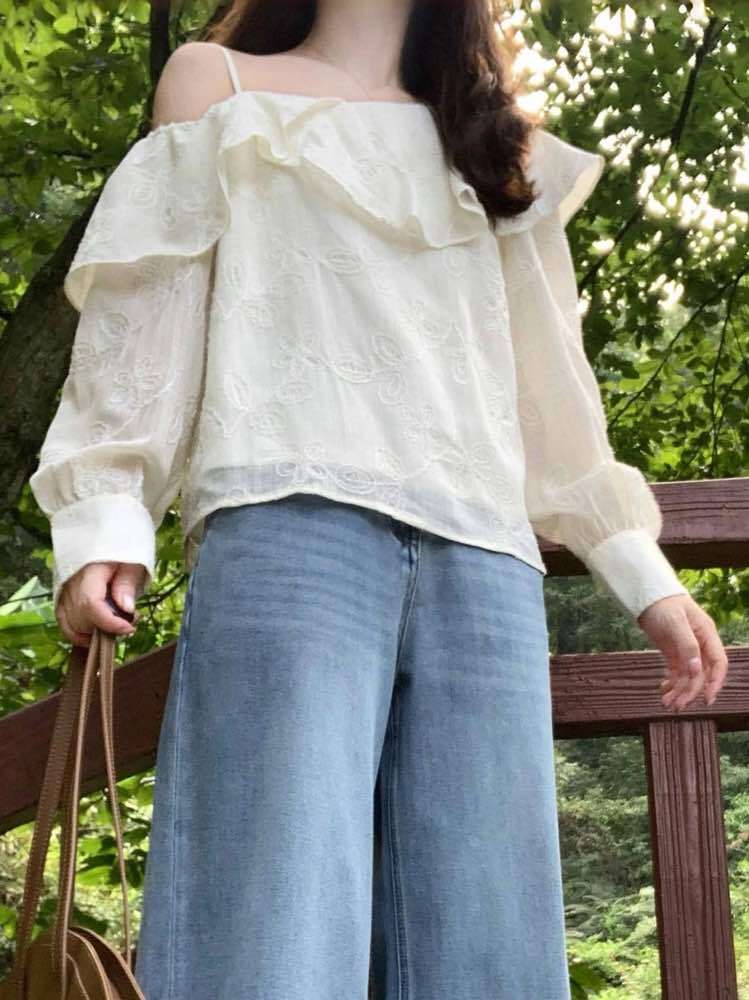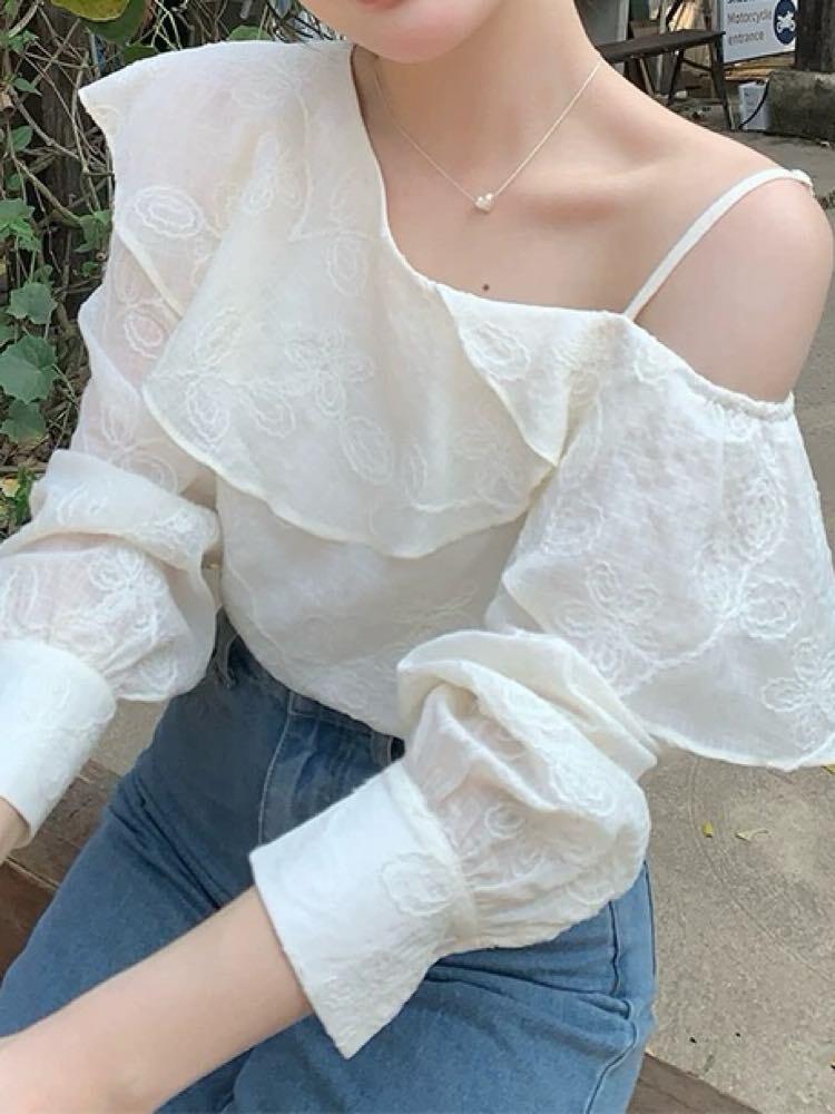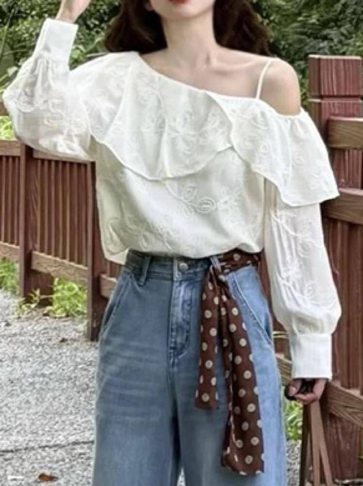 花柄とふんわりフリルが目を惹く、上品なワンショルダー長袖ブラウス♡