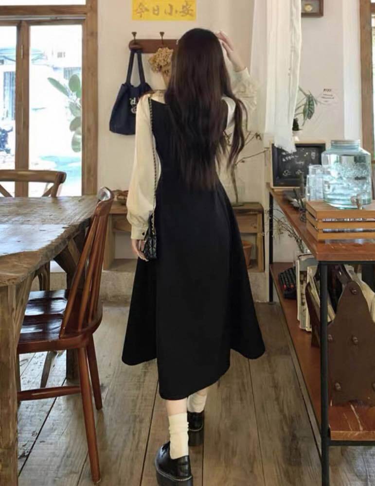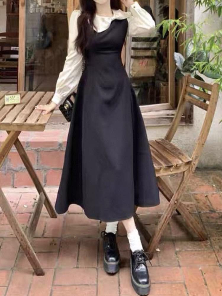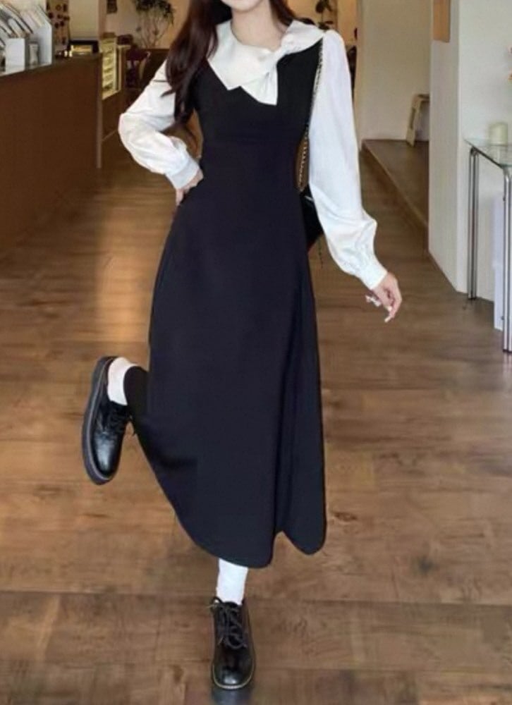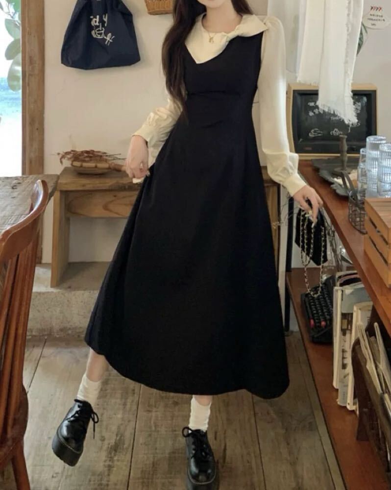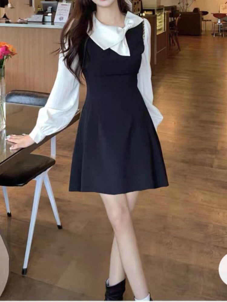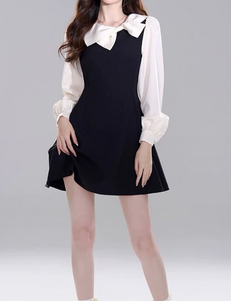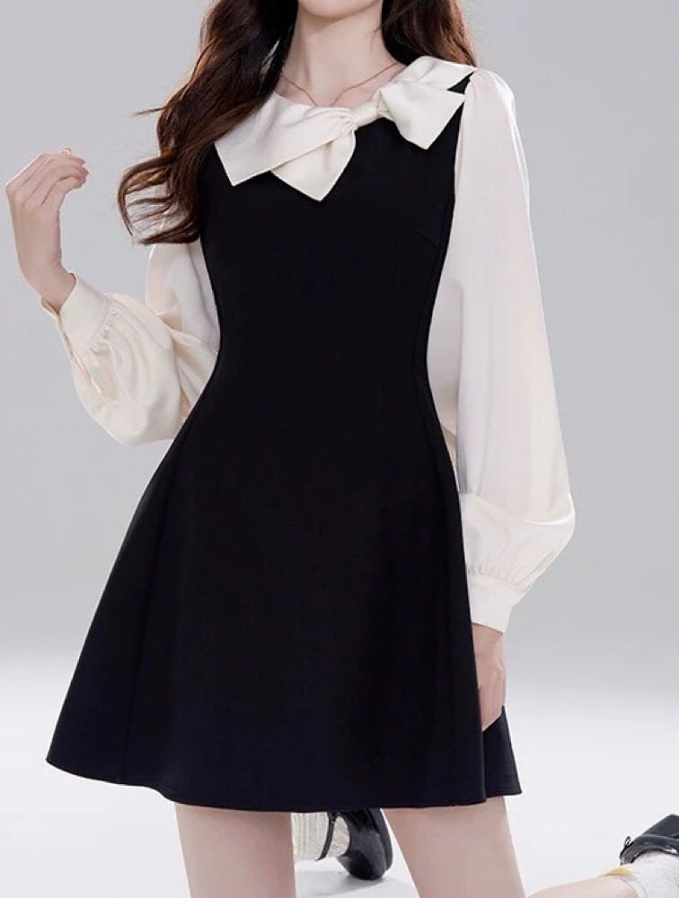 リボン襟が映える主役級ワンピース♪ リボン襟モノクロワンピース 大人可愛い 上品 清楚 おしゃれ モノクロ リボン きれいめ きちんと感 お呼ばれ 細見え 脚長 大きいサイズ 韓国 CH10987