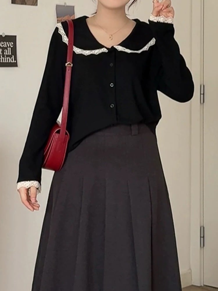 ガーリーな大きめ丸襟で小顔見え ワンポイントレースリブトップス 長袖 レース 大人可愛い おしゃれ リブ きれいめ 上品 清楚 カジュアル バイカラー レイヤード 細見え 大きいサイズ 韓国 CH10981