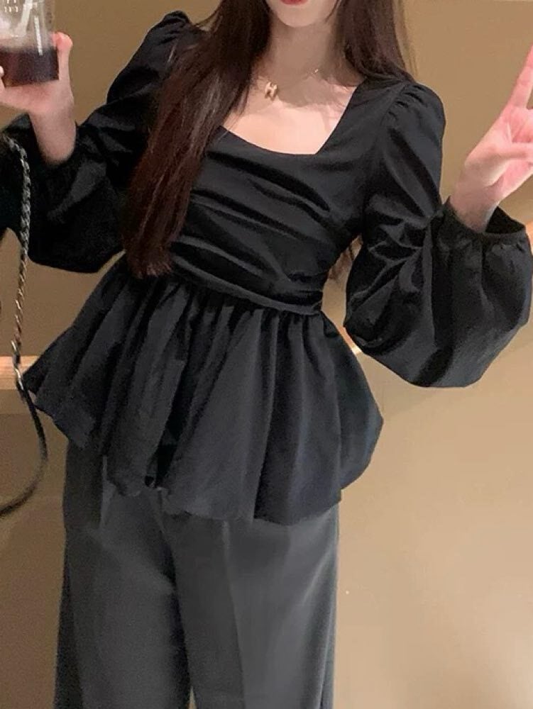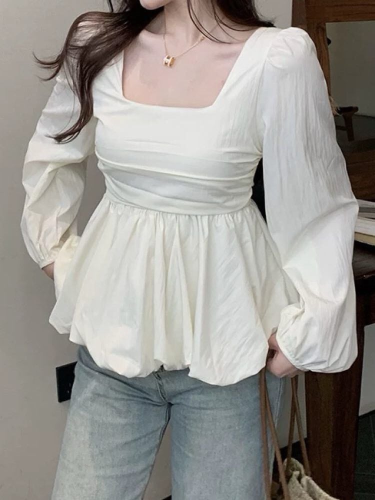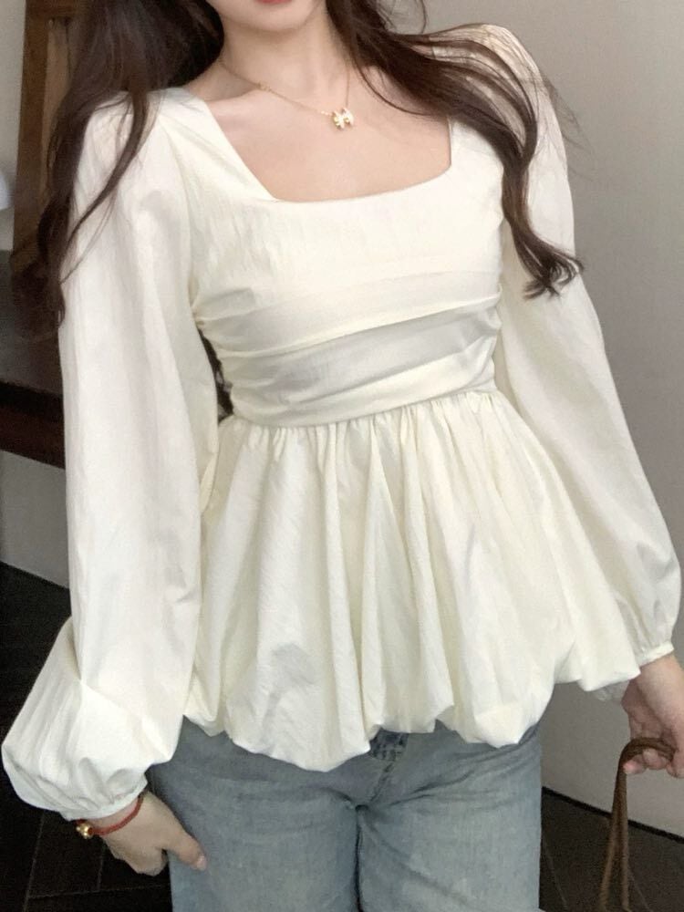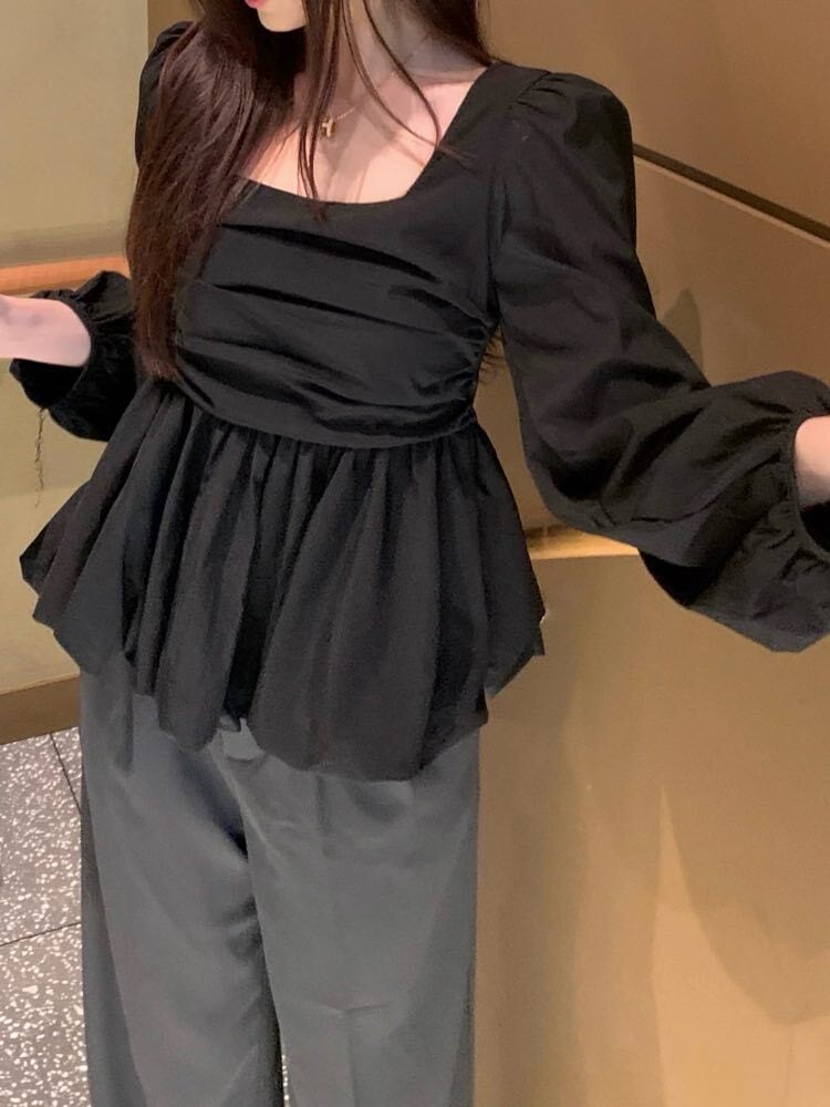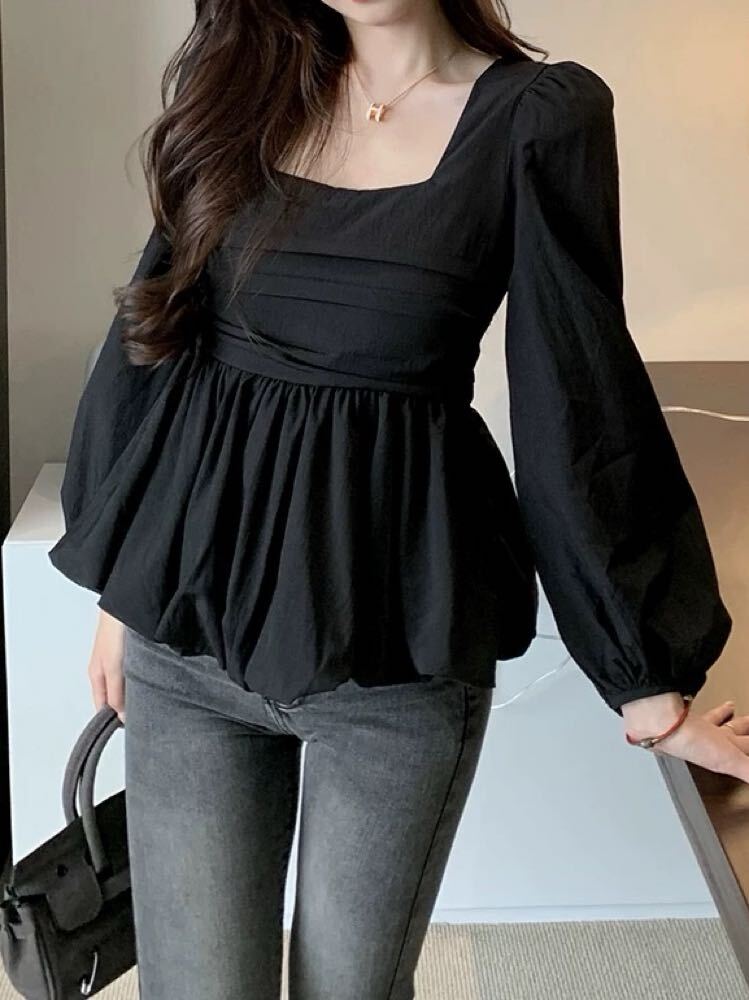 着るだけでメリハリ美人見え バルーンペプラムトップス 長袖 大人可愛い 上品 おしゃれ フェミニン きれいめ スクエアネック ペプラム くびれ 体型カバー 大きいサイズ 韓国 CH10983