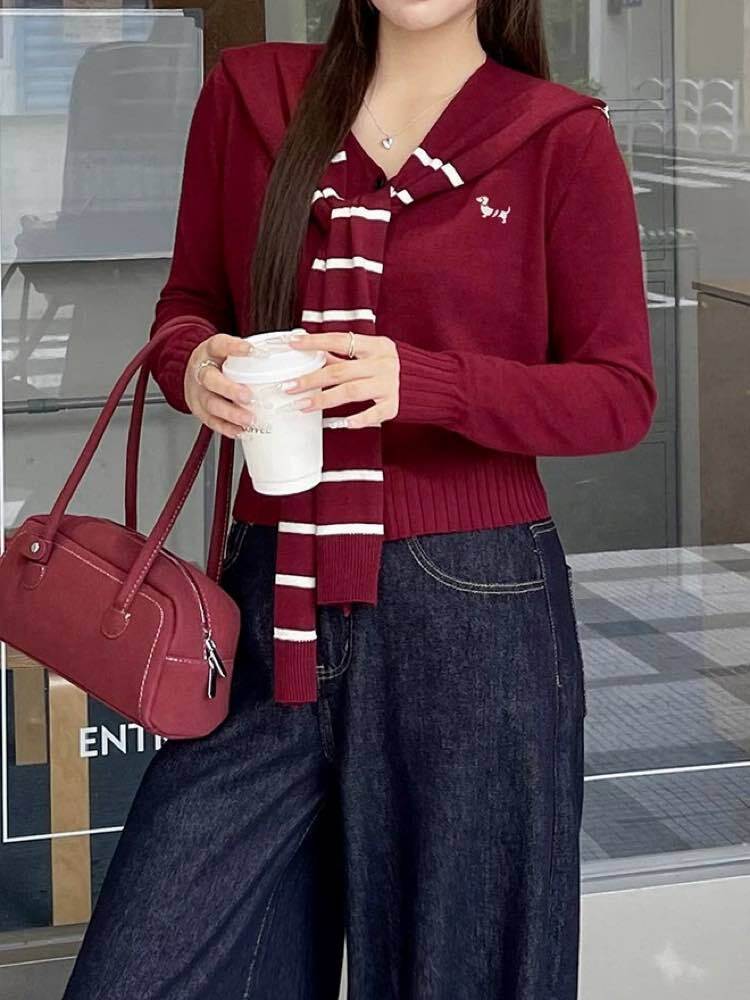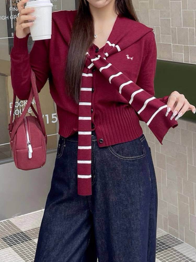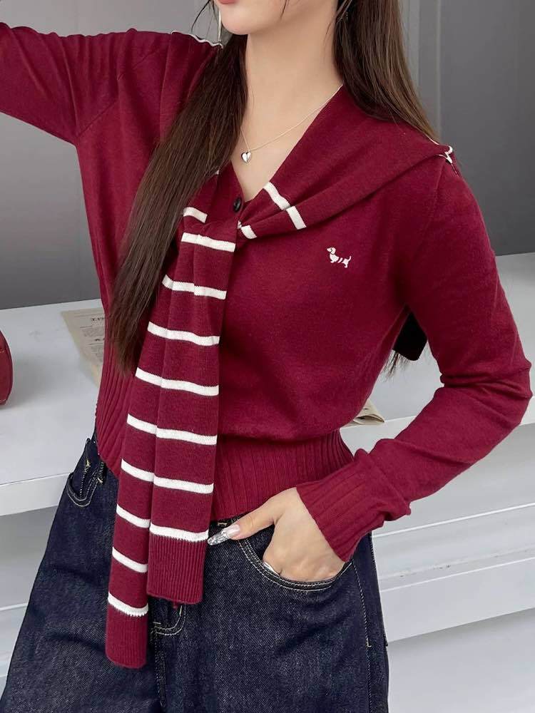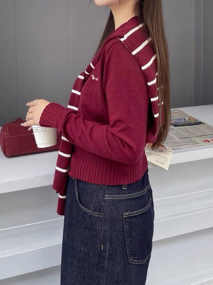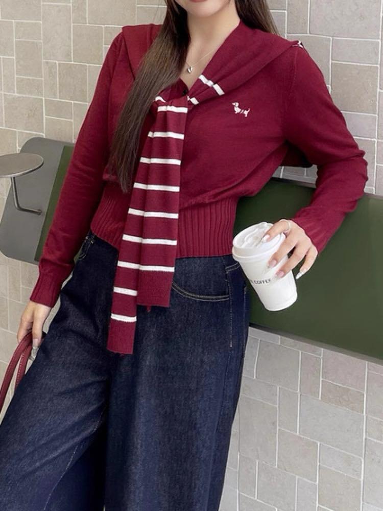 こだわりデザインで気分もコーデも格上げ! 肩掛けドッキングニットトップス おしゃれ 大人可愛い ボーダー 刺繍 Vネック クロップド丈 リブ 細見え くびれ 大きいサイズ 韓国 CH11108