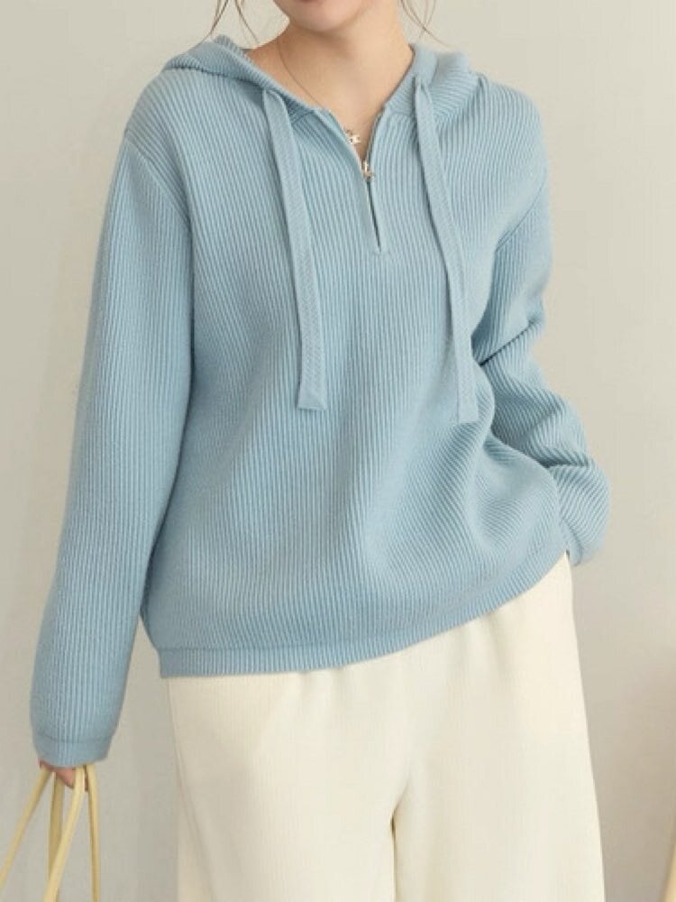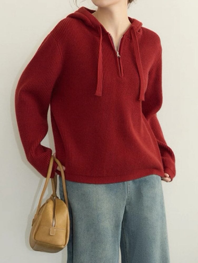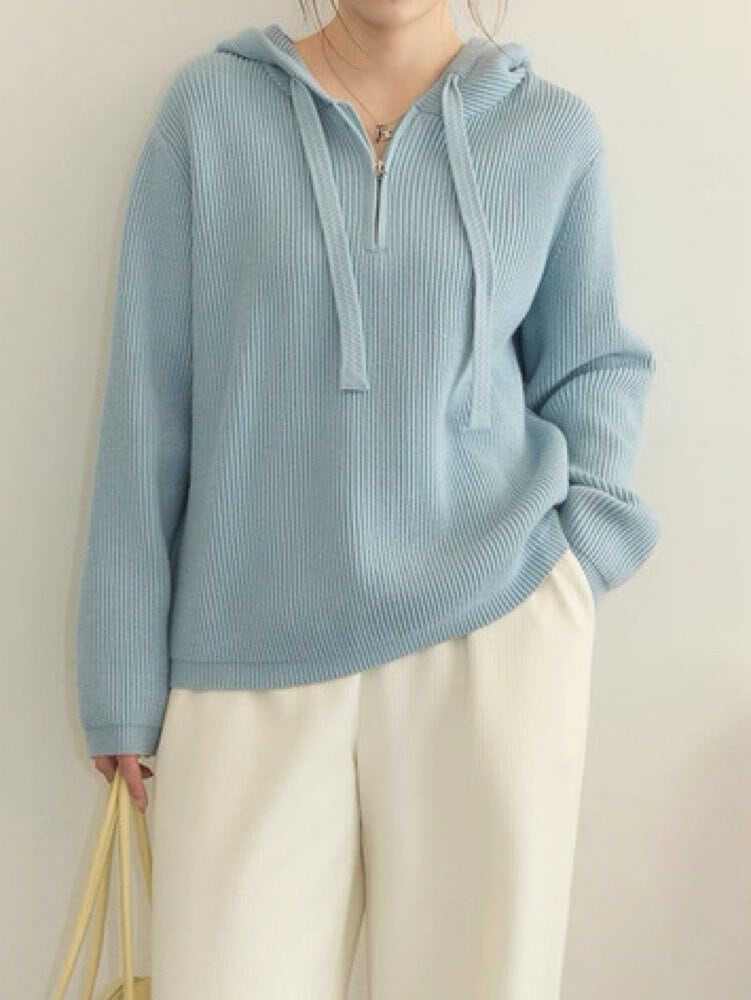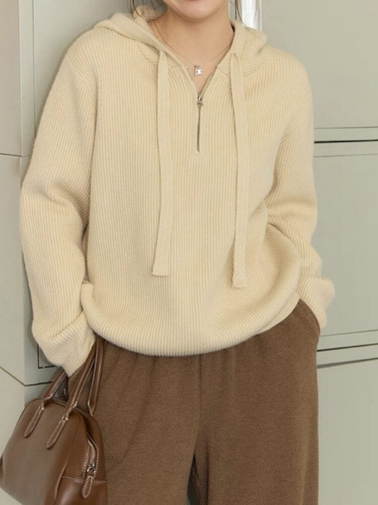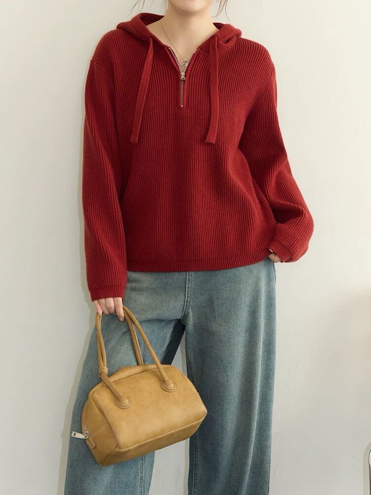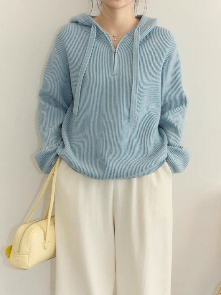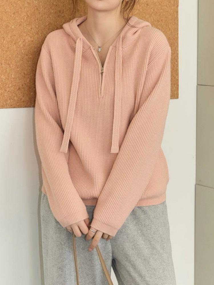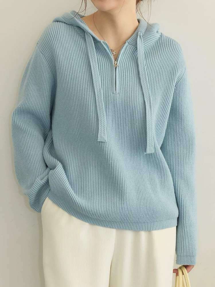 ゆるっと楽ちん大人のこなれカジュアル フード付ハーフジップリブニットトップス 長袖 おしゃれ カジュアル 大人 リブ トレンド リラクシー 細見え 体型カバー 大きいサイズ 韓国 CH11111