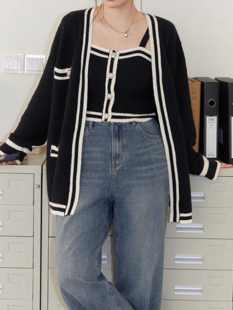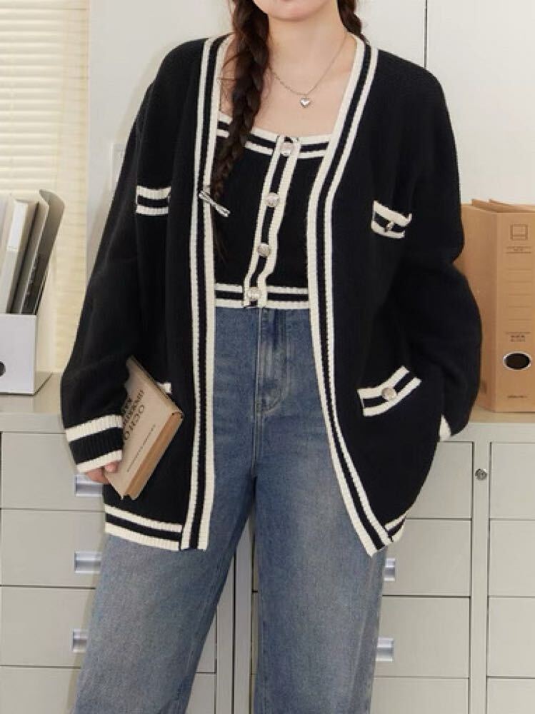 シンプルに華やぐ秋冬スタイル モノトーンタンクトップ×オーバーサイズカーディガン 2点セット おしゃれ 大人 クール カジュアル モノトーン シルバー ライン 細見え 体型カバー 大きいサイズ 韓国 CH11117
