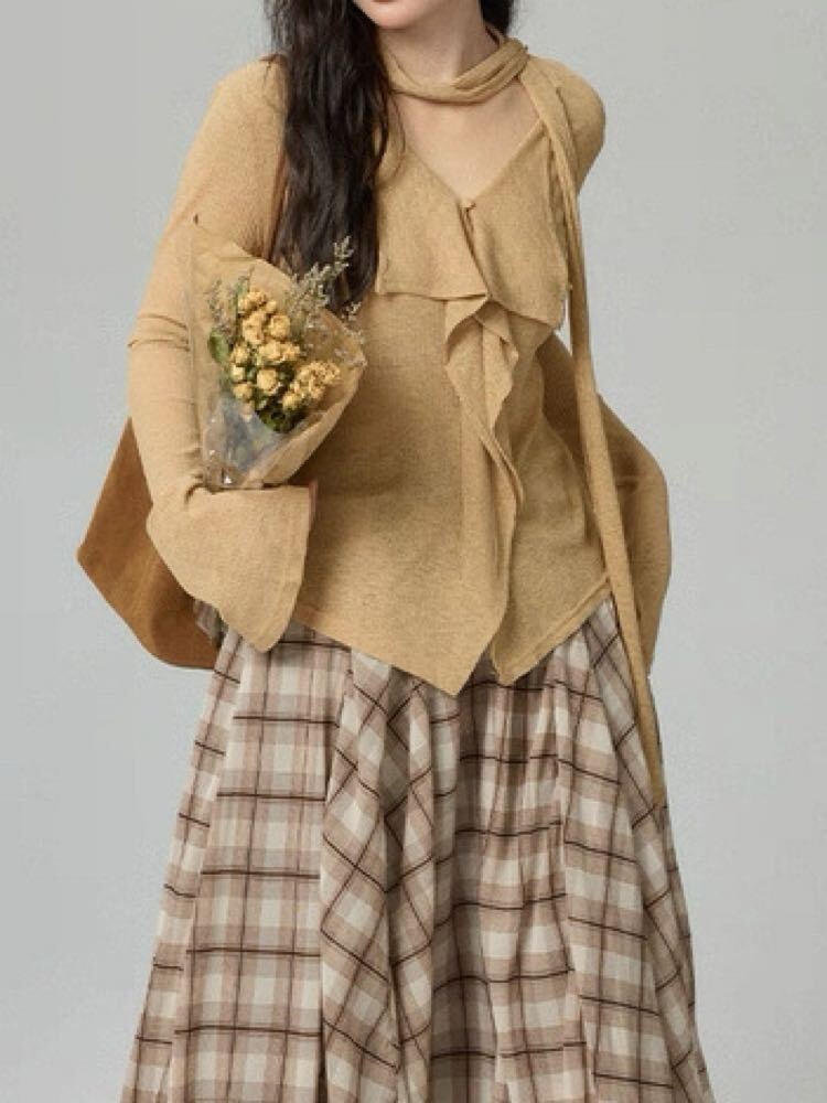 エレガントなシルエットが魅力 ボウタイ付フレアスリーブブラウス 大人可愛い フリル 上品 カジュアル きれいめ Vネック おしゃれ リブ 体型カバー 大きいサイズ 韓国 CH11121