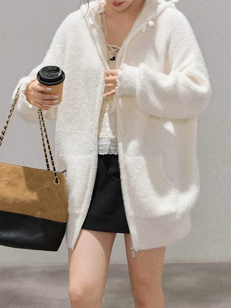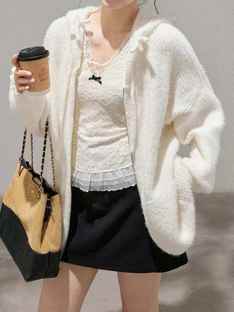 360°カワイイ愛されニットカーデ♡ フードリボンオーバーサイズニットカーディガン 大人可愛い おしゃれ リボン フリル もこもこ ガーリー カジュアル 体型カバー 大きいサイズ 韓国 CH11138