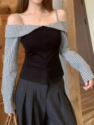 "ギンガムチェックドッキングオフショルトップス"