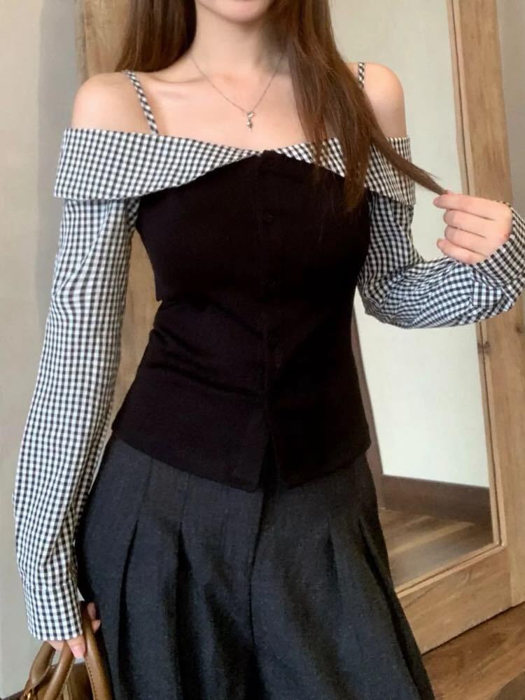 キュートな肌見せで視線独り占め♡ ギンガムチェックドッキングオフショルトップス 大人可愛い 肌見せ チェック柄 長袖 おしゃれ 着映え 細見え デート 大きいサイズ 韓国 CH11140