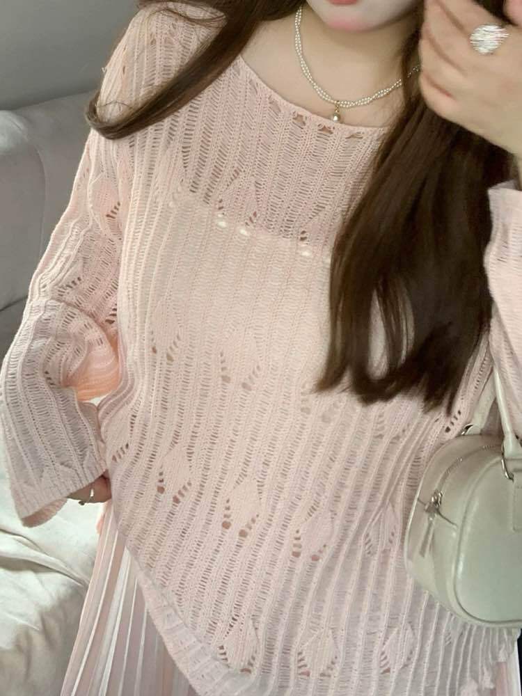 ほんのり色っぽカジュアル♡ 透かし編みリブニットトップス シアー 大人可愛い おしゃれ ストライプ ダイヤ柄 シャーベットカラー ガーリー フェミニン カジュアル デート 肌見せ 体型カバー 大きいサイズ 韓国 CH11143