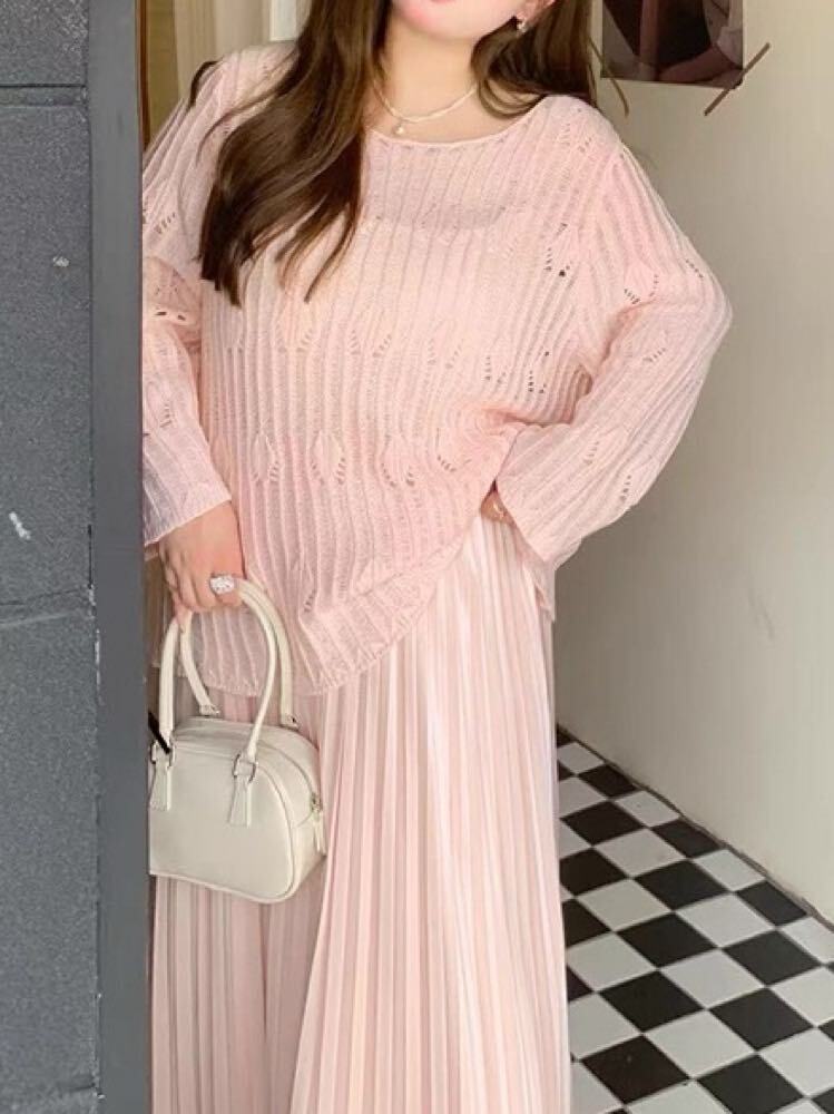 ゆるめのシルエットと縦ラインの編み模様で、気になるボディラインをさりげなくカバーしながら女の子らしい雰囲気に♪