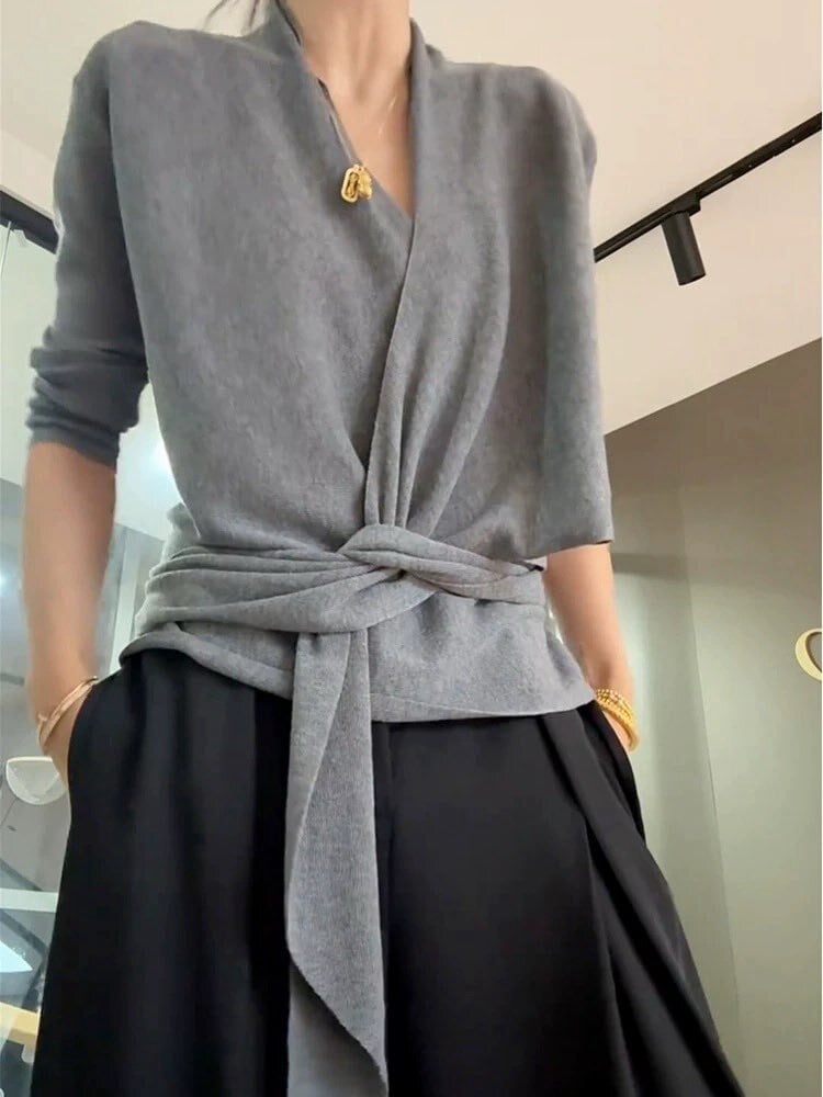 大人の余裕をまとって周囲を魅了 ラップ風ウエストマークニットシャツ 大人 上品 セクシー Vネック くびれ オフィス カジュアル 細見え 体型カバー 大きいサイズ 韓国 CH11154