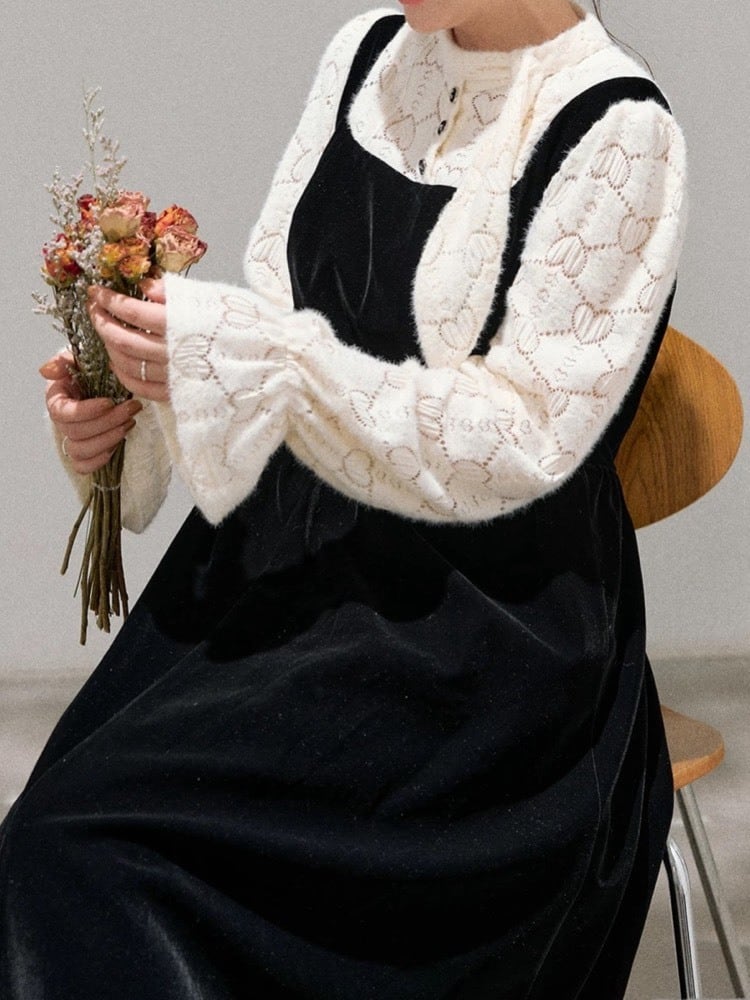 柔らかなハート柄ニットと、しっとりベロアキャミを重ねたような上品デザイン。