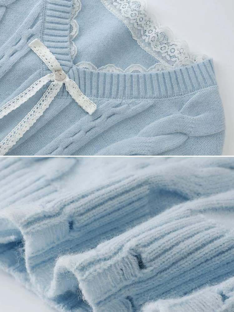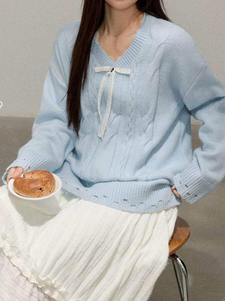 秋冬大人ガーリーの決定版♡ レースリボンケーブル風オーバーニット 大人可愛い レース リボン おしゃれ フェミニン ガーリー カジュアル リラクシー デート Vネック 体型カバー 大きいサイズ 韓国 CH11162