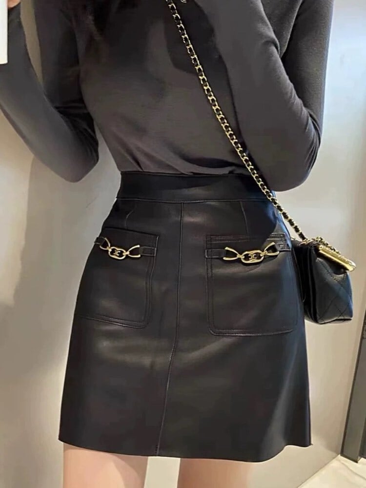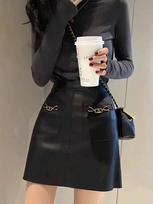 マットなツヤ感でつくる今っぽ美脚スタイル メタルチャームレザーミニスカート 大人可愛い 上品 おしゃれ クール きれいめ レザー ゴールド ブラック 美脚 細見え 大きいサイズ 韓国 CH11189