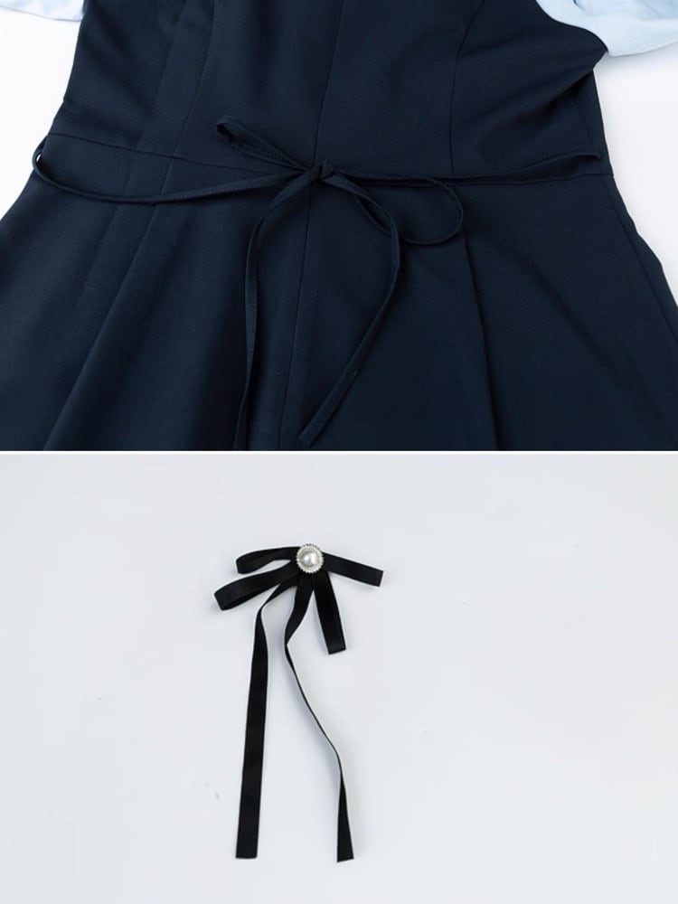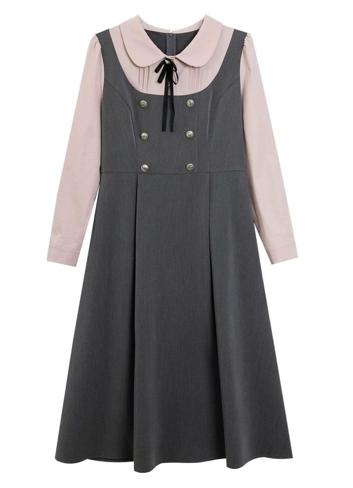 上品クラシカルできちんと可愛い カラーブラウスドッキングダブルボタンワンピース 長袖 おしゃれ 大人可愛い 上品 清楚 バイカラー シルバー パール リボン クラシカル ミディ丈 体型カバー 大きいサイズ 韓国 CH11182