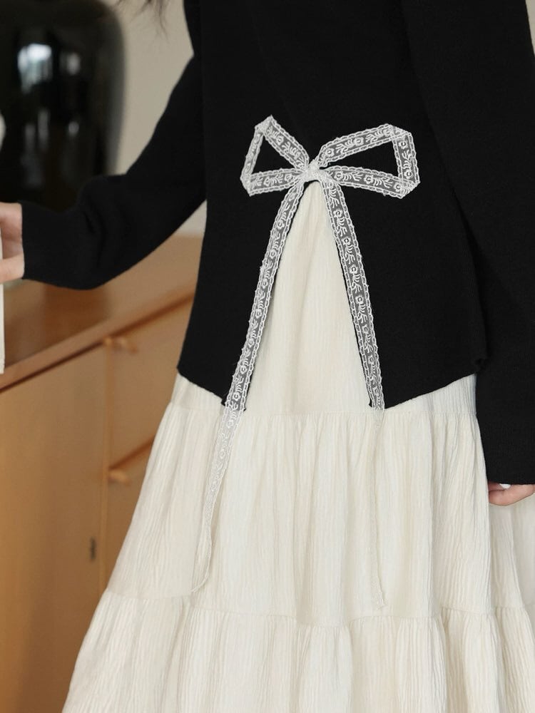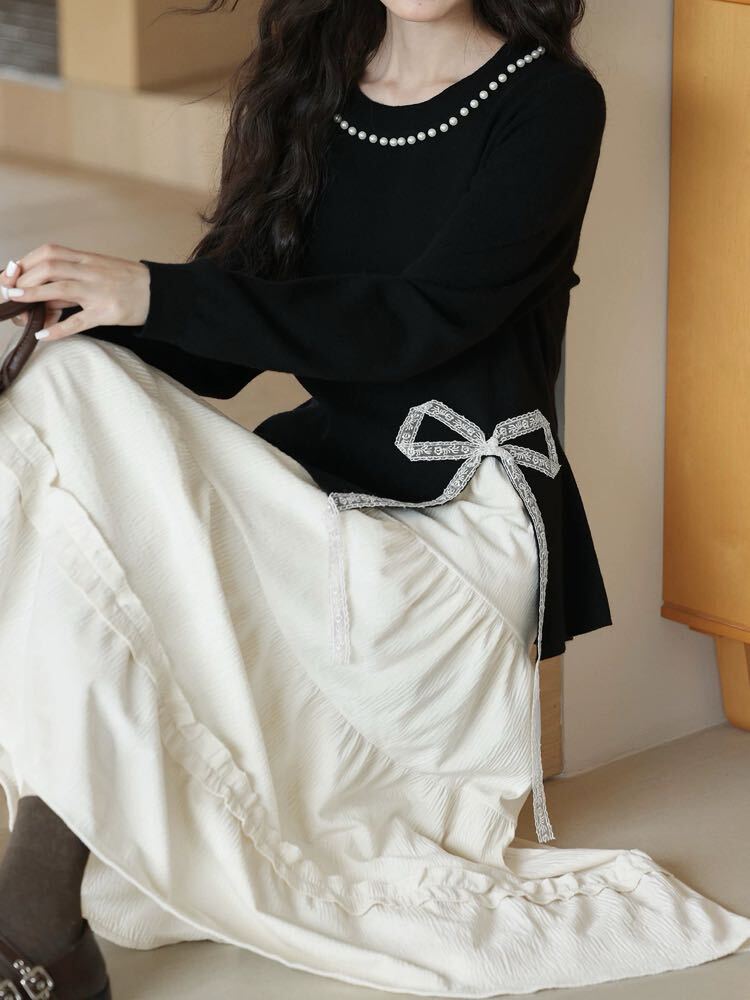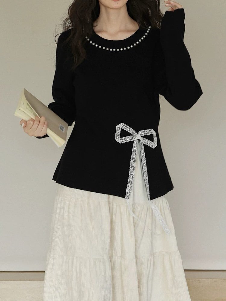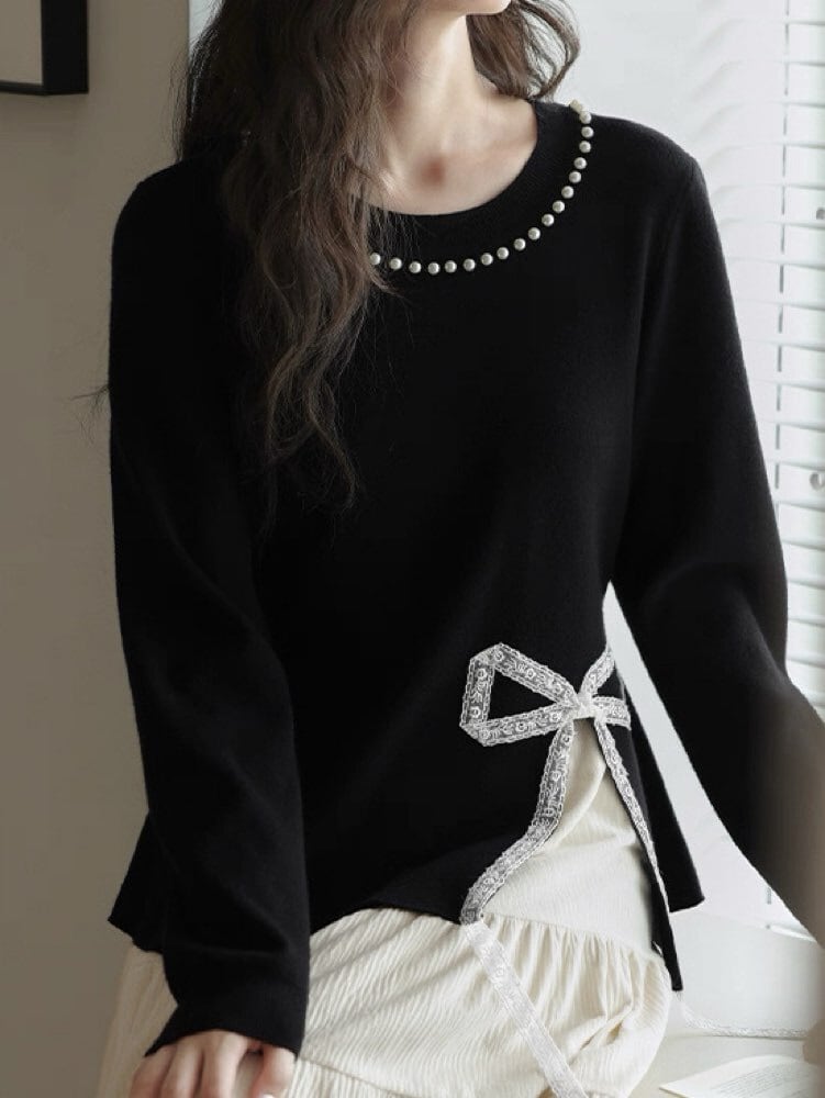 上品な華やかさをひとさじプラス♡ パールネックレースリボンペプラムニット 大人可愛い シック 上品 きれいめ おしゃれ パール レース リボン くびれ スタイルアップ オケージョン 食事会 お呼ばれ 細見え 体型カバー 大きいサイズ 韓国 CH11184