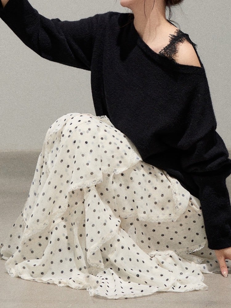 上品なドット柄とふんわり広がるシルエットが魅力のロングスカート。