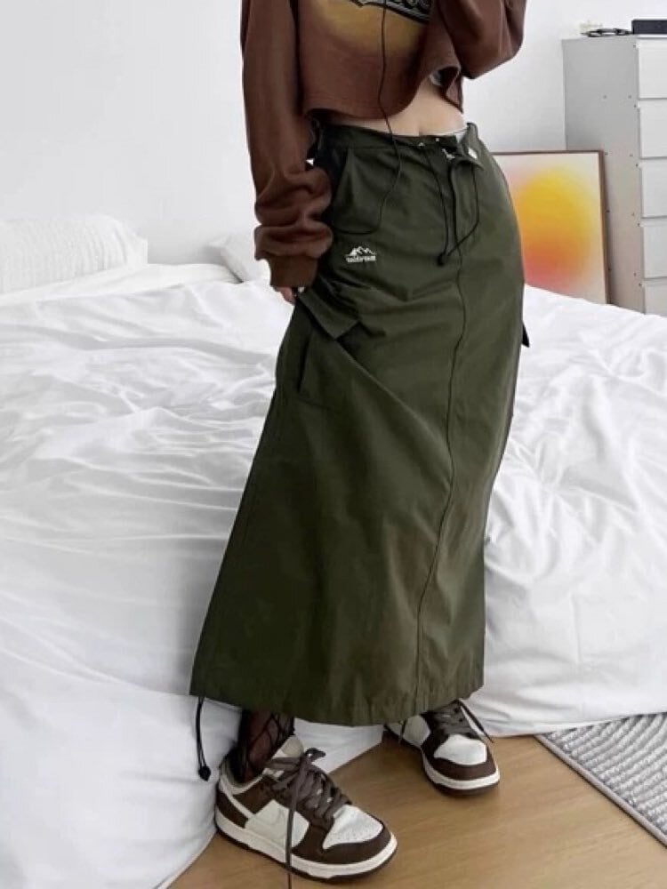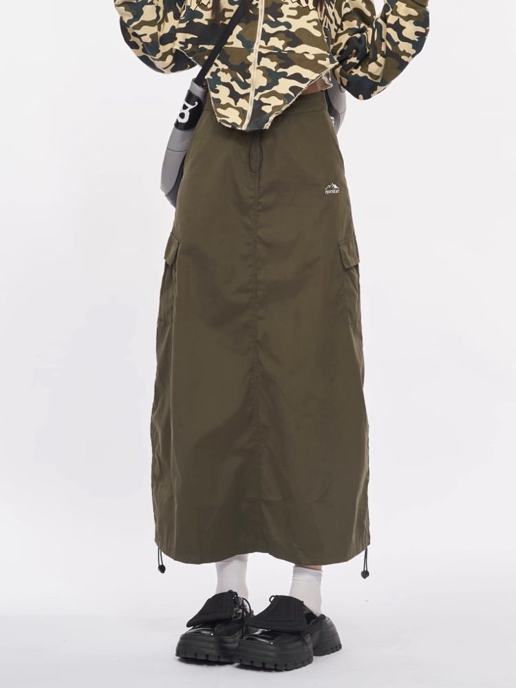 シルエット自在な旬顔スタイルに サイドドロストカーゴスカート ミディ丈 おしゃれ 大人可愛い カジュアル ストリート ロゴ 刺繍 こなれ感 着回し 体型カバー 大きいサイズ 韓国 CH11194