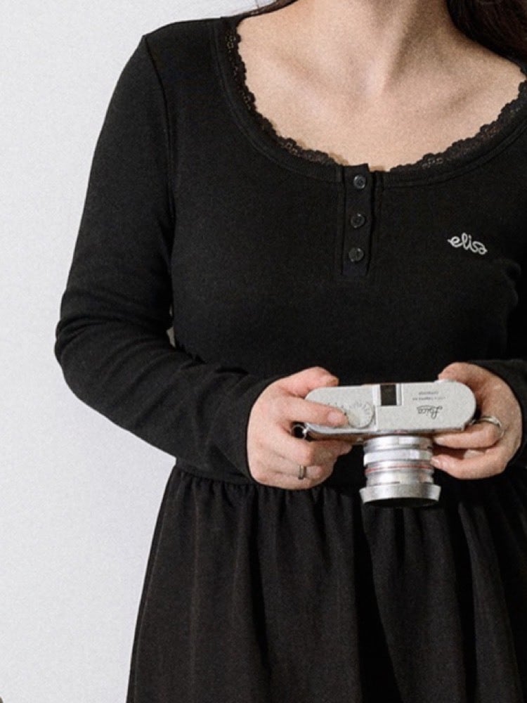 胸元のレースとボタンデザインがほどよい甘さをプラスし、深めのUネックがデコルテを美しく見せます。