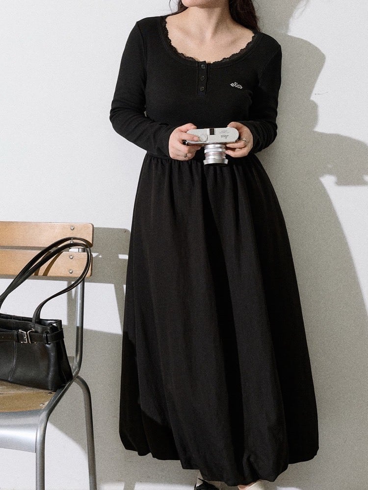 一枚で雰囲気美人 バルーンロングワンピース 長袖 大人可愛い ロング丈 おしゃれ シンプル ガーリー カジュアル 着回し くびれ 細見え 体型カバー 大きいサイズ 韓国 CH11236