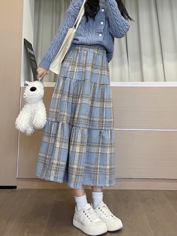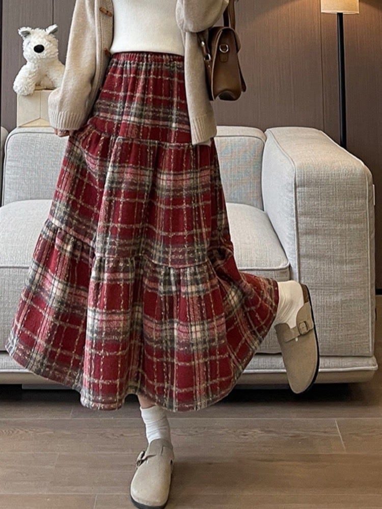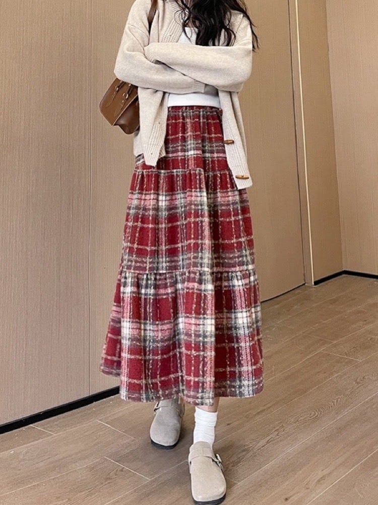 ふわっと揺れて冬もかわいく チェック柄ティアードスカート 大人可愛い おしゃれ 上品 脚長 着回し 体型カバー 大きいサイズ 韓国 CH11241