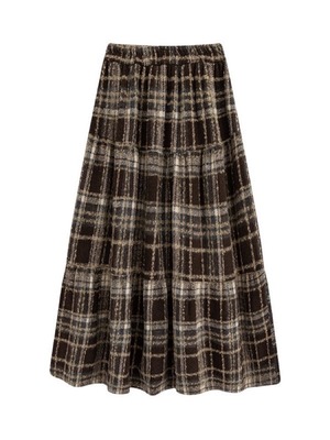 ふんわりと広がるティアードシルエットが、歩くたびに優しく揺れるチェック柄ロングスカート。