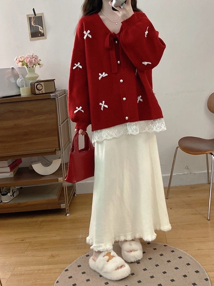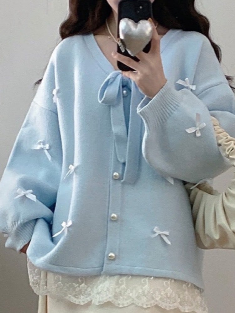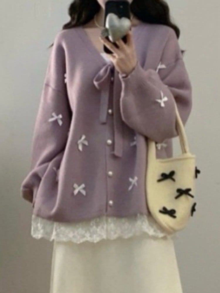 ふんわり甘くやさしさをまとう リボンレース裾カーディガン 長袖 差し色 大人可愛い パールボタン ガーリー フェミニン かわいい 体型カバー 大きいサイズ 韓国 CH11245