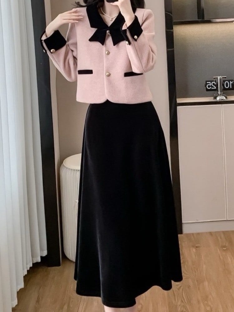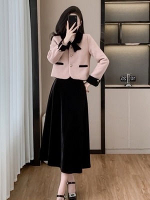 甘すぎない可愛さで印象アップ ジャケット×黒スカート上品セットアップ フォーマル お呼ばれ オフィス 大人可愛い お洒落 きちんと 体型カバー 大きいサイズ 韓国 CH11254