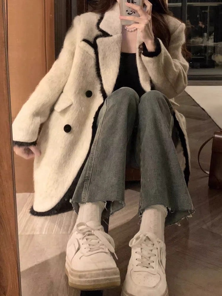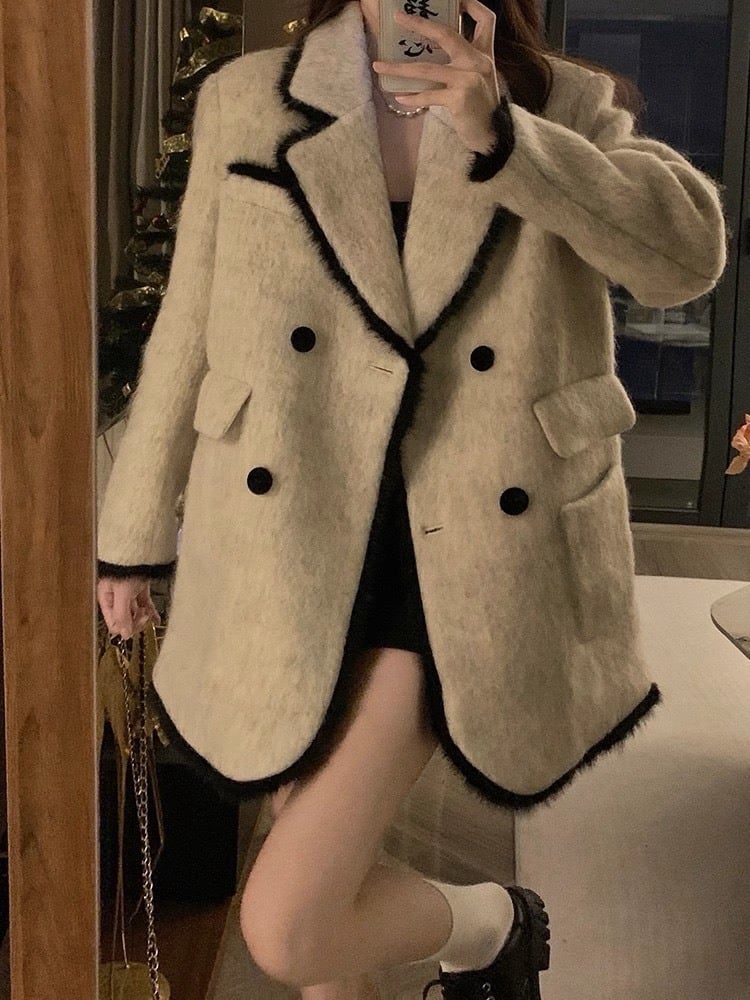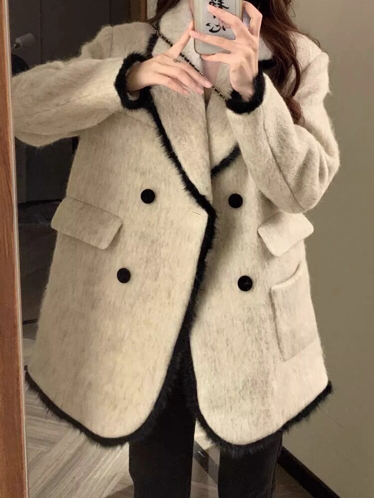 甘さとモードを両立する パイピング入りふわふわコート お洒落 大人可愛い キュート 淡色 もこもこ ミドル丈 体型カバー 大きいサイズ 韓国 CH11255