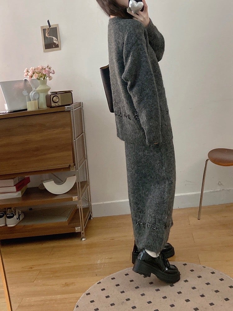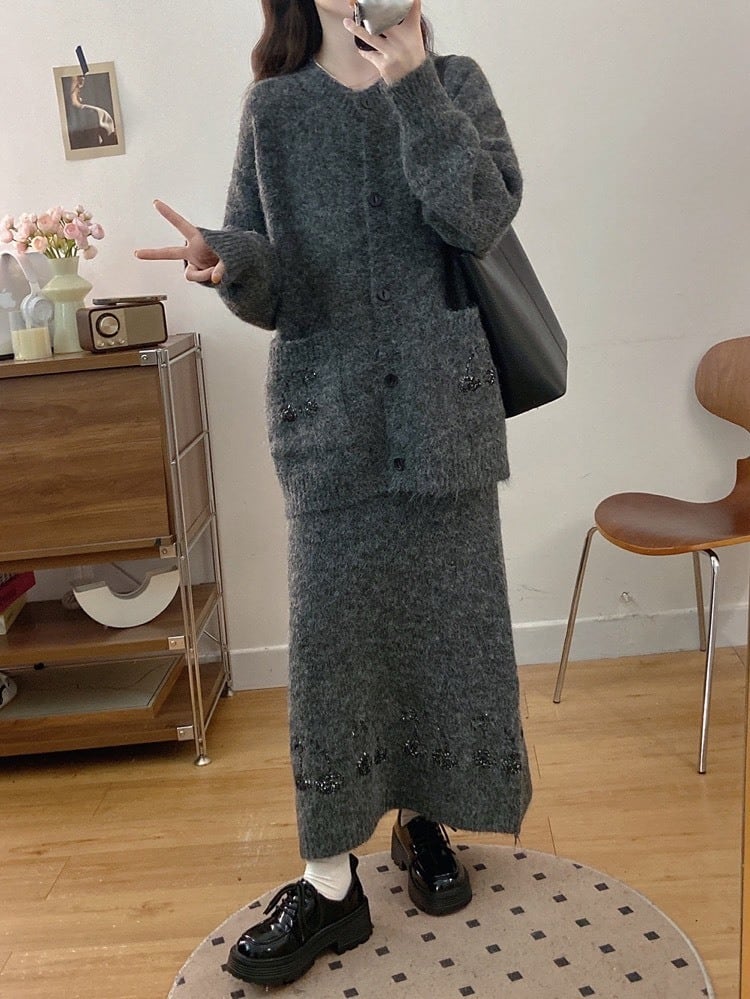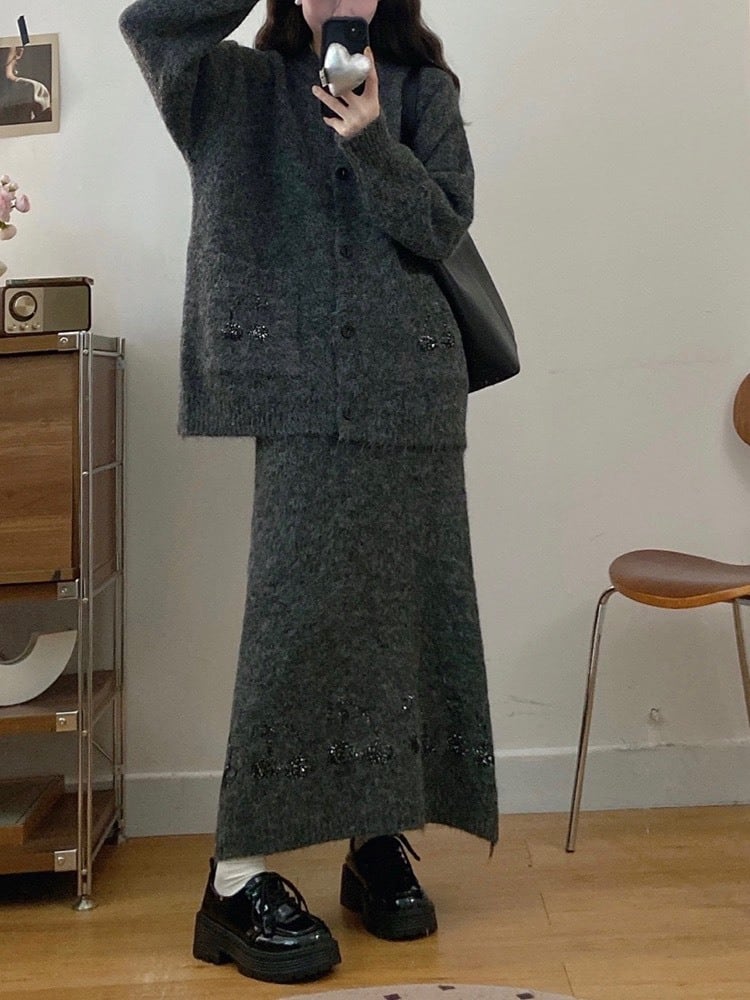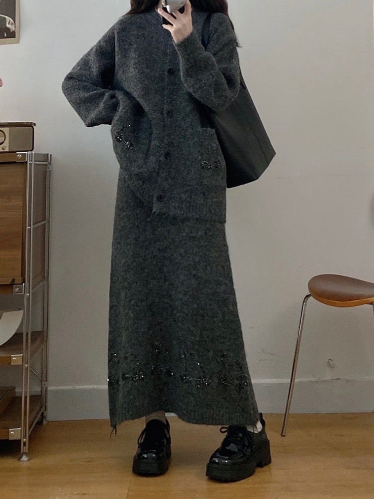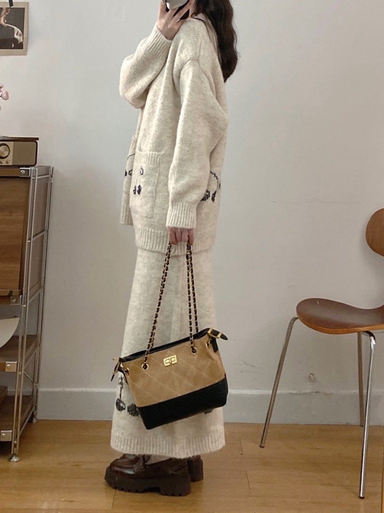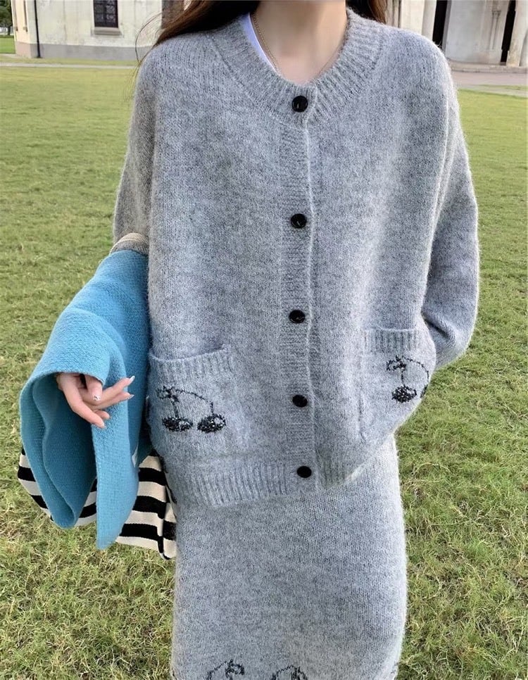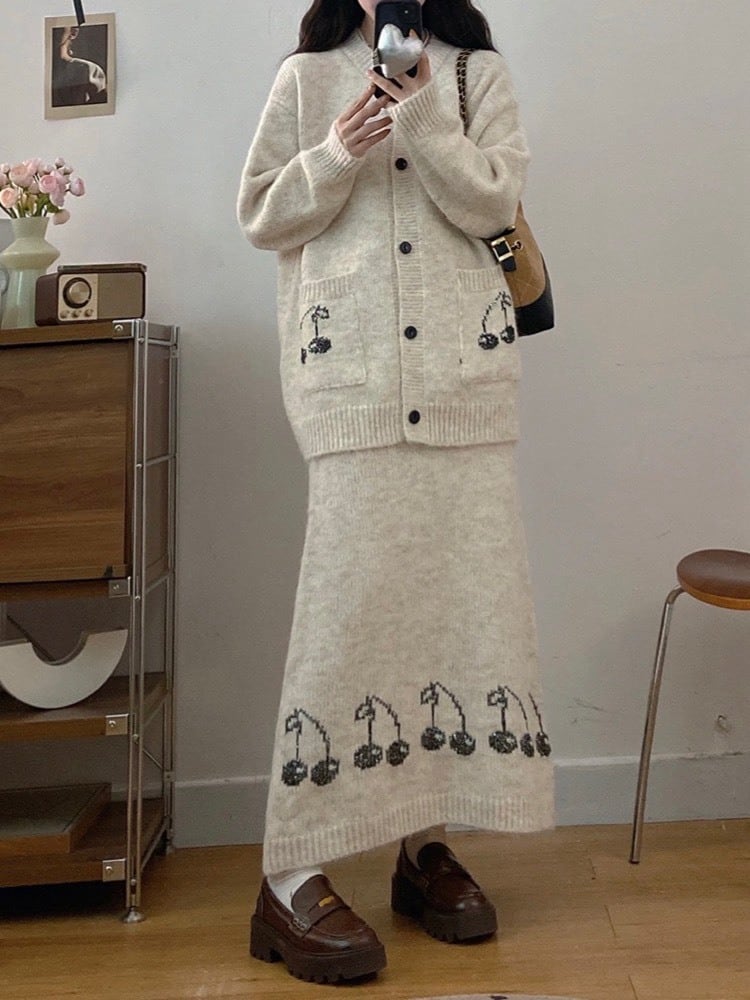 ふんわり甘い冬をまとう チェリー刺繍大人ガーリーニットアップ 淡色 ふわもこニット ゆるカーディガン 大人可愛い お洒落 体型カバー 大きいサイズ 韓国 CH11261