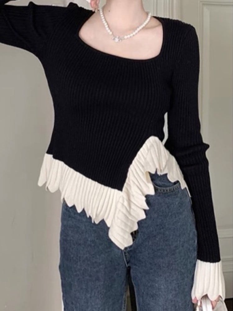着るだけで韓国っぽ美人 メリハリ配色ニット おしゃれ アイドル 変形 個性 フェミニン カジュアル 体型カバー 大きいサイズ 韓国 CH11259
