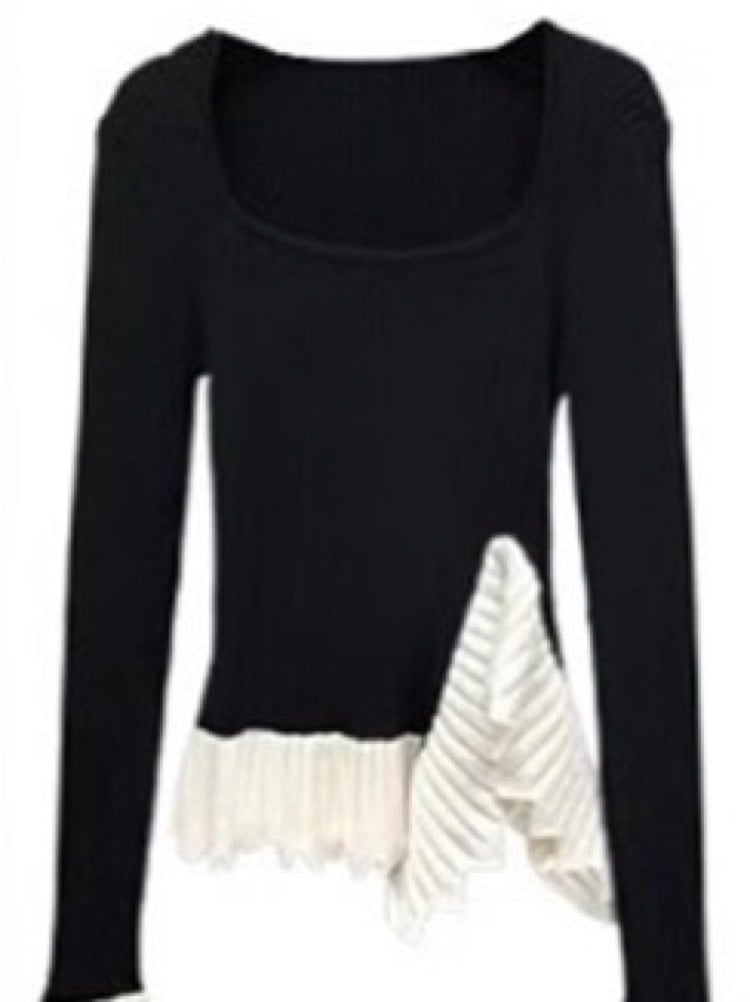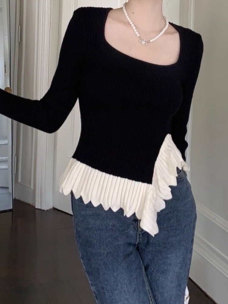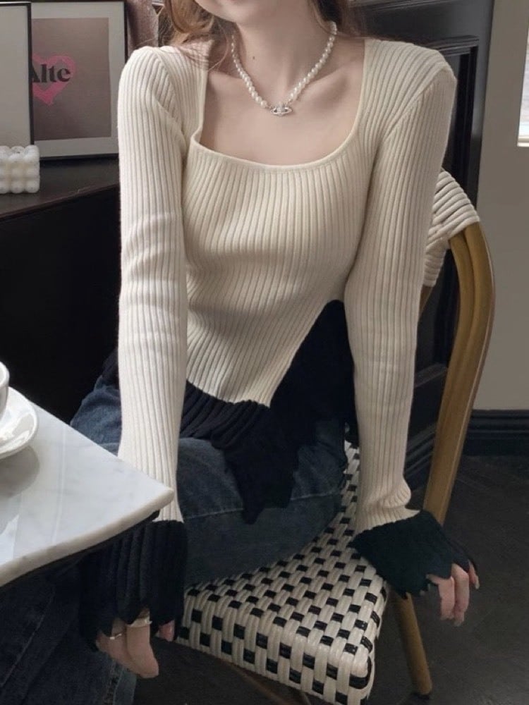 韓国ファッションのエッセンスをぎゅっと詰め込んだ、スクエアネック配色ニット。