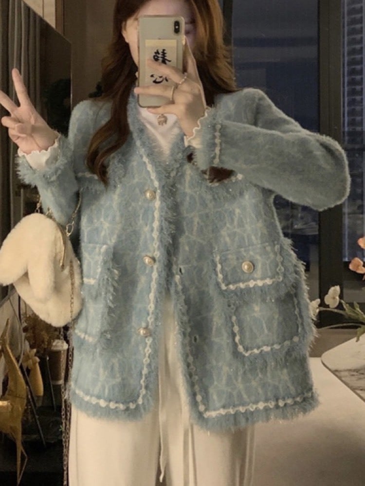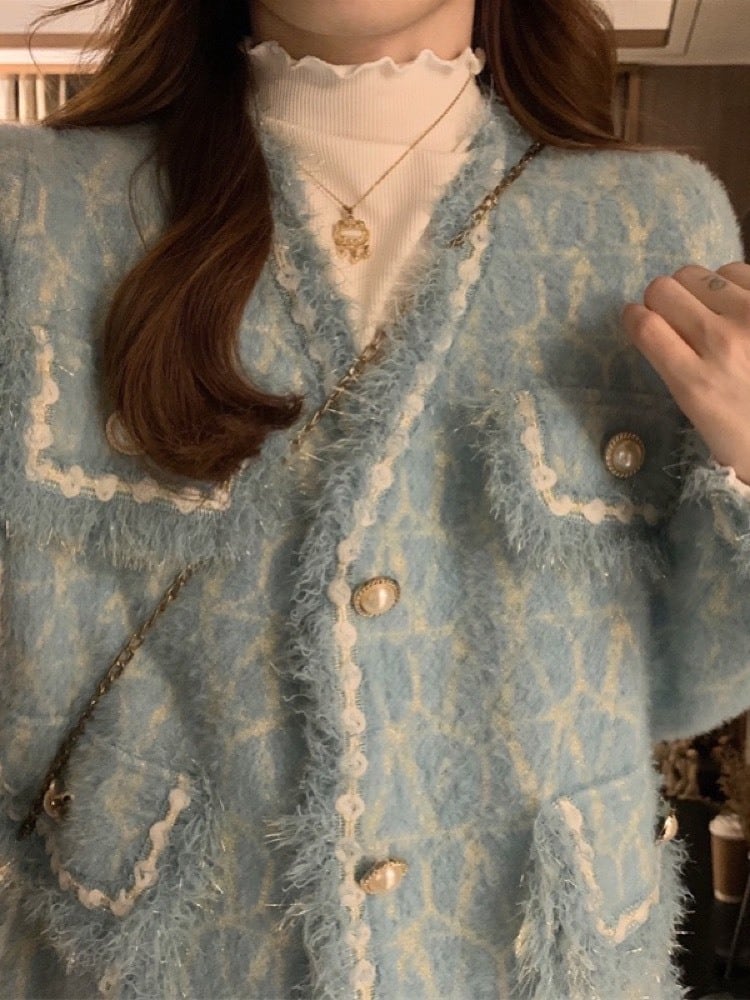 柔らかいツイード調の編地が高級感を漂わせ、着るだけでコーデ全体が華やかに整います。