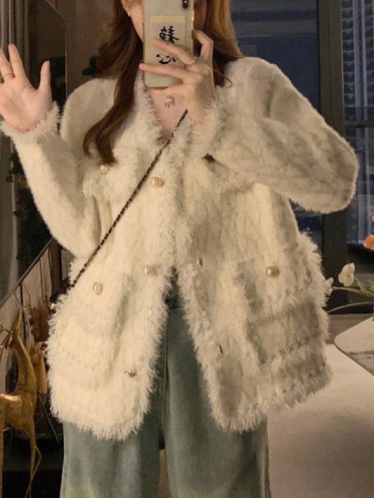 上品なパールボタンとふわりとした毛足が目を引く、冬の主役級ふわもこジャケット。