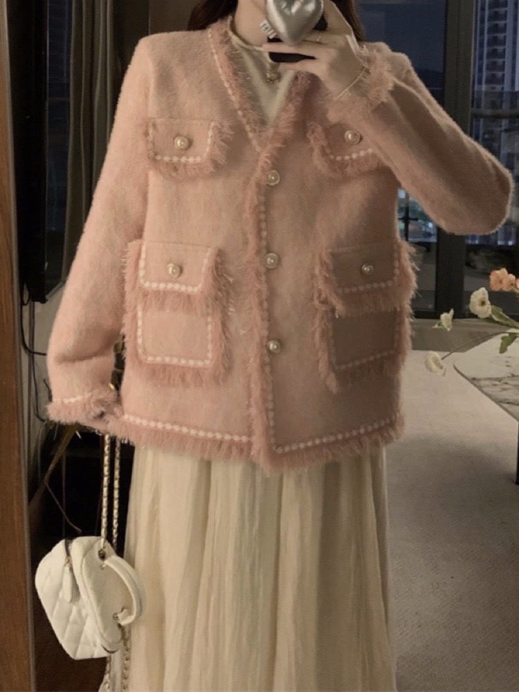 着るだけで雰囲気美人 ふわシャギーパールボタンジャケット 長袖 差し色 大人可愛い ガーリー フェミニン かわいい 体型カバー 大きいサイズ 韓国 CH11265
