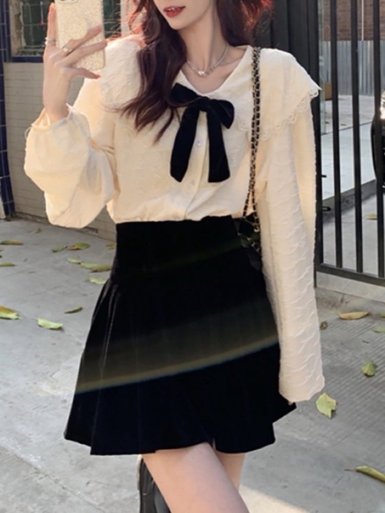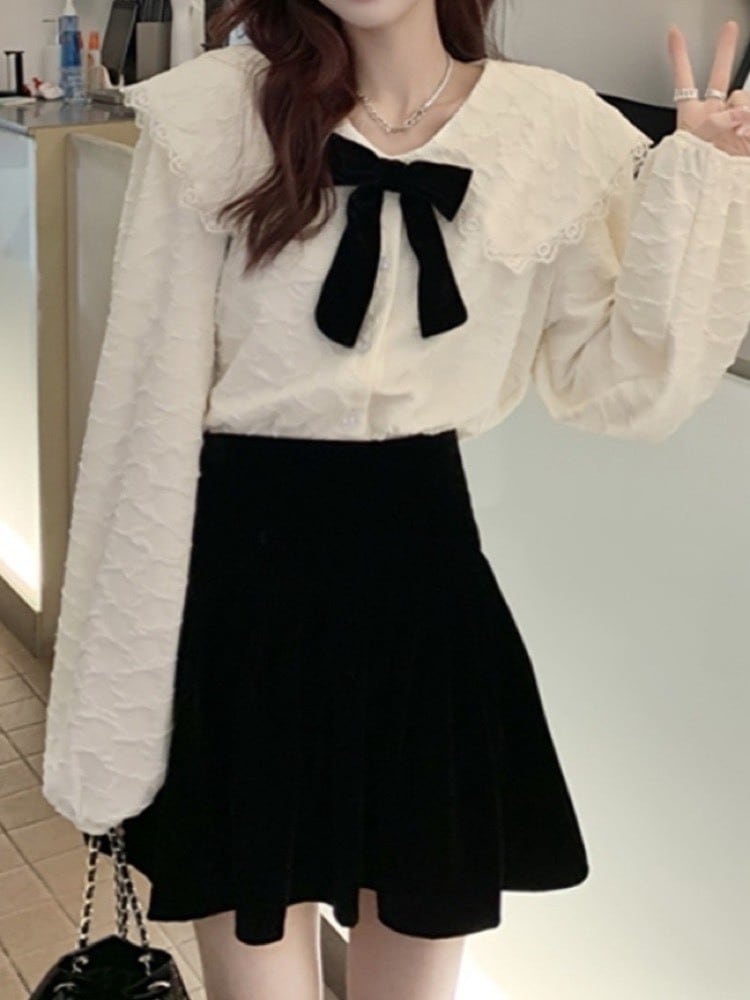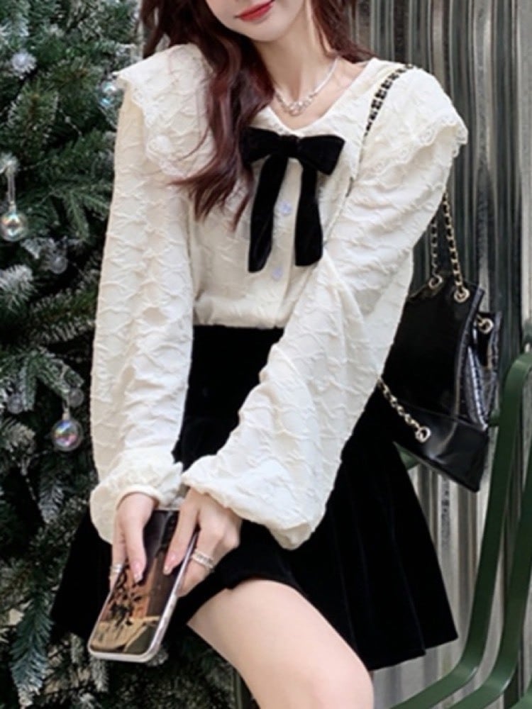 存在感のある大きめの襟と、胸元のブラックリボンが印象的な韓国ガーリーの主役ブラウス。全体に織り込まれたふんわりとした凹凸のある生地が、