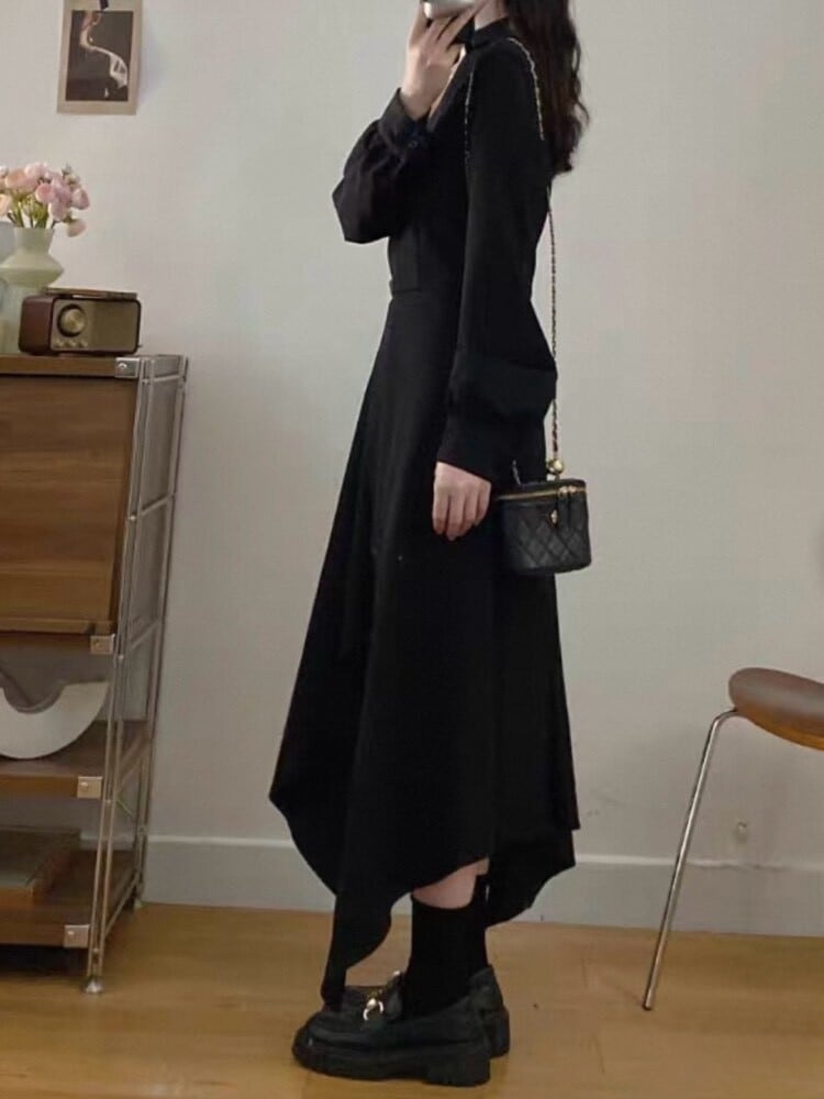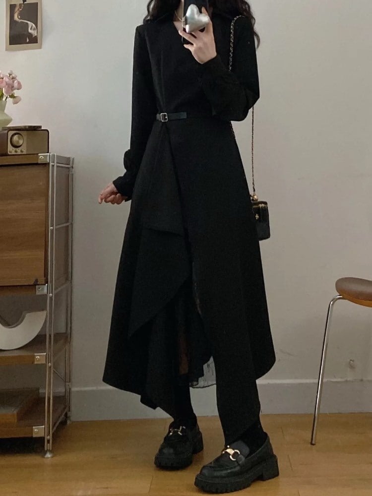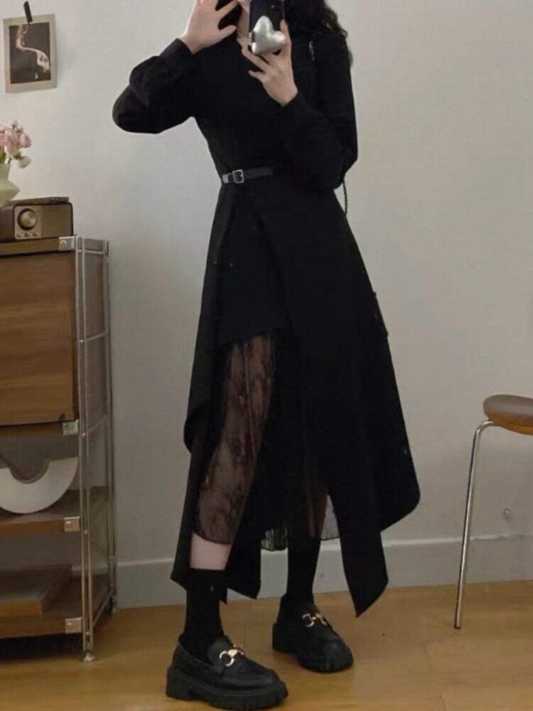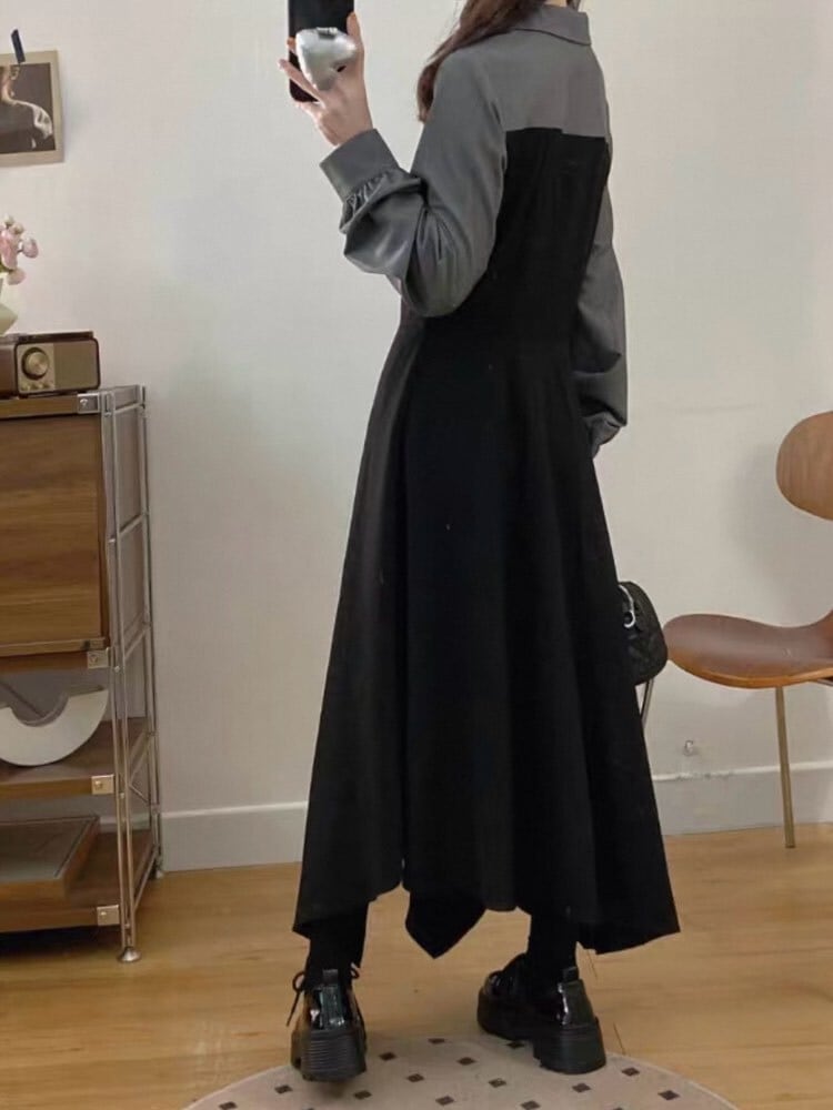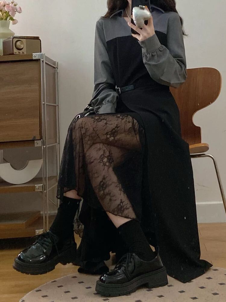 歩くたび色っぽ可愛く魅せる サイドスリットシャツワンピース 大人可愛い お洒落 ロング丈 肌見せ セクシー レース Vネック 異素材 バイカラー 細見え くびれ 体型カバー 大きいサイズ 韓国 CH11220
