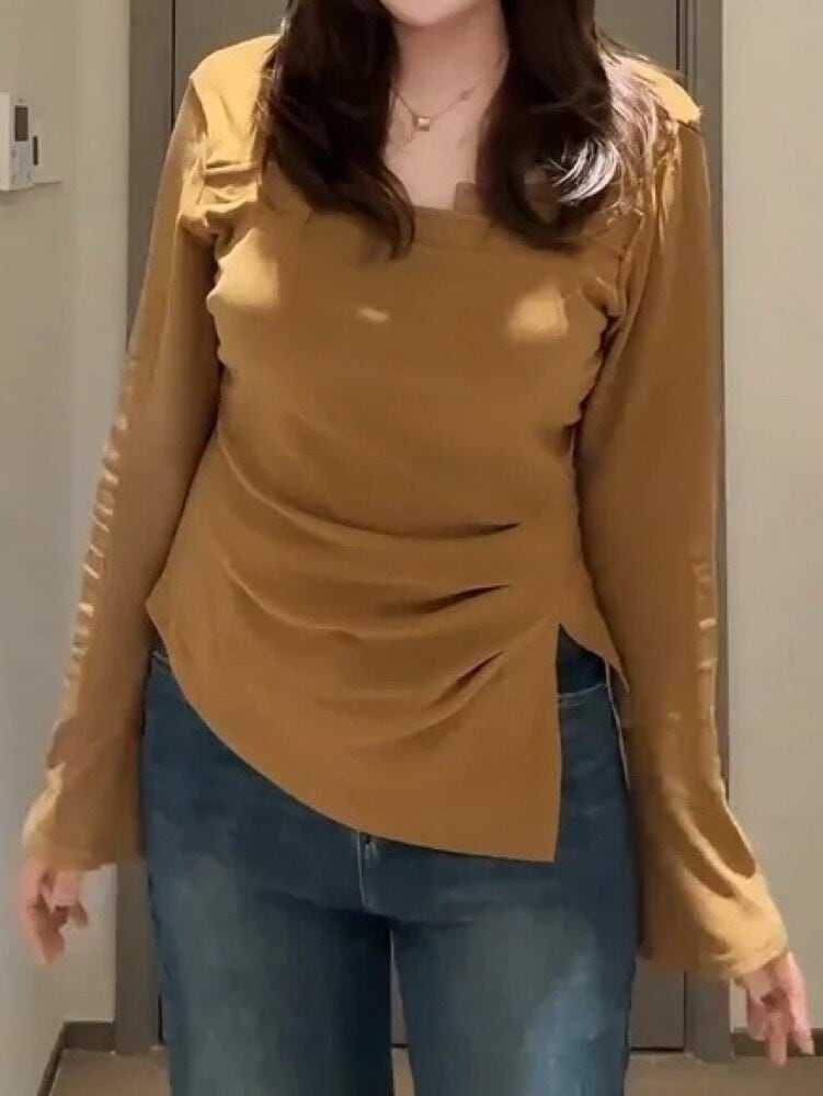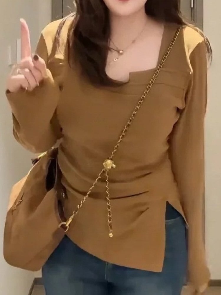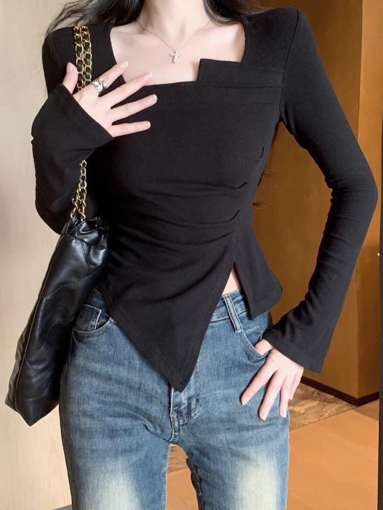 さり気なく盛れる変形デザイン スリットインスクエアネックカットソー 大人可愛い シンプル お洒落 スリット セクシー スリット 細見え くびれ 体型カバー 大きいサイズ 韓国 CH11221
