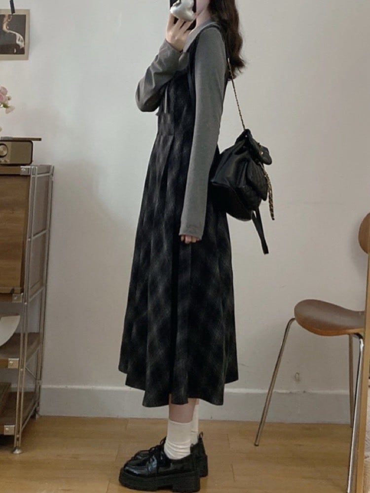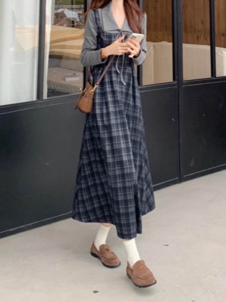 落ち着いたトーンのチェック柄が視線を惹きつける、クラシカルなロングワンピース。