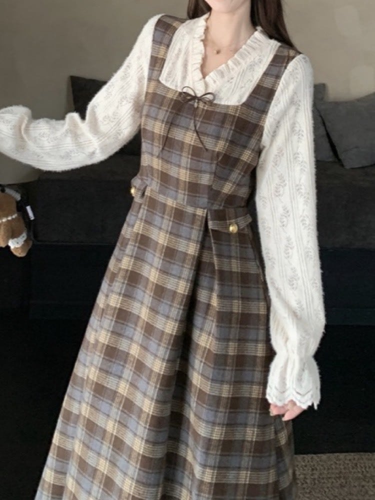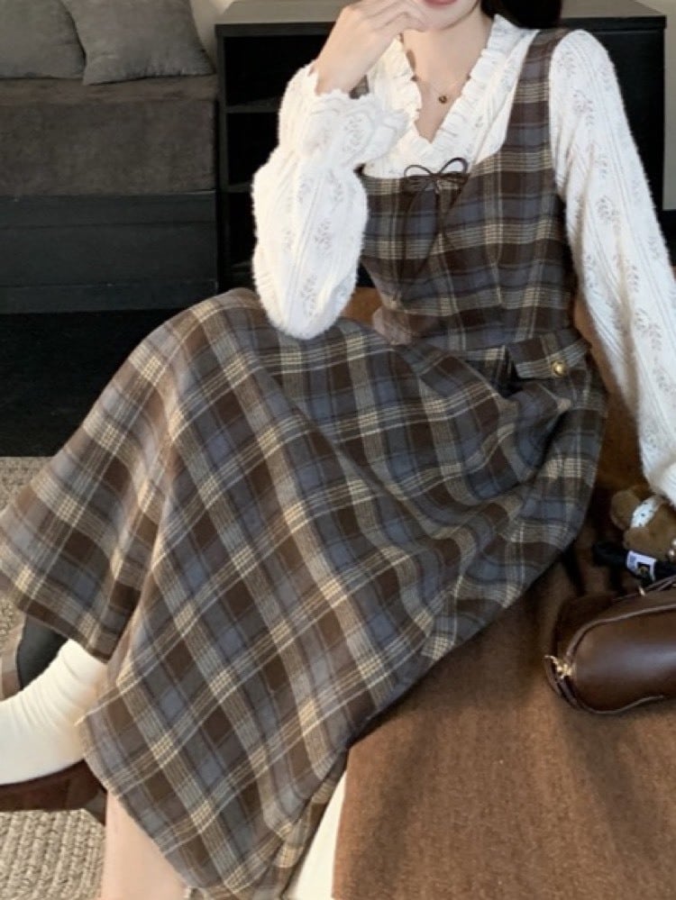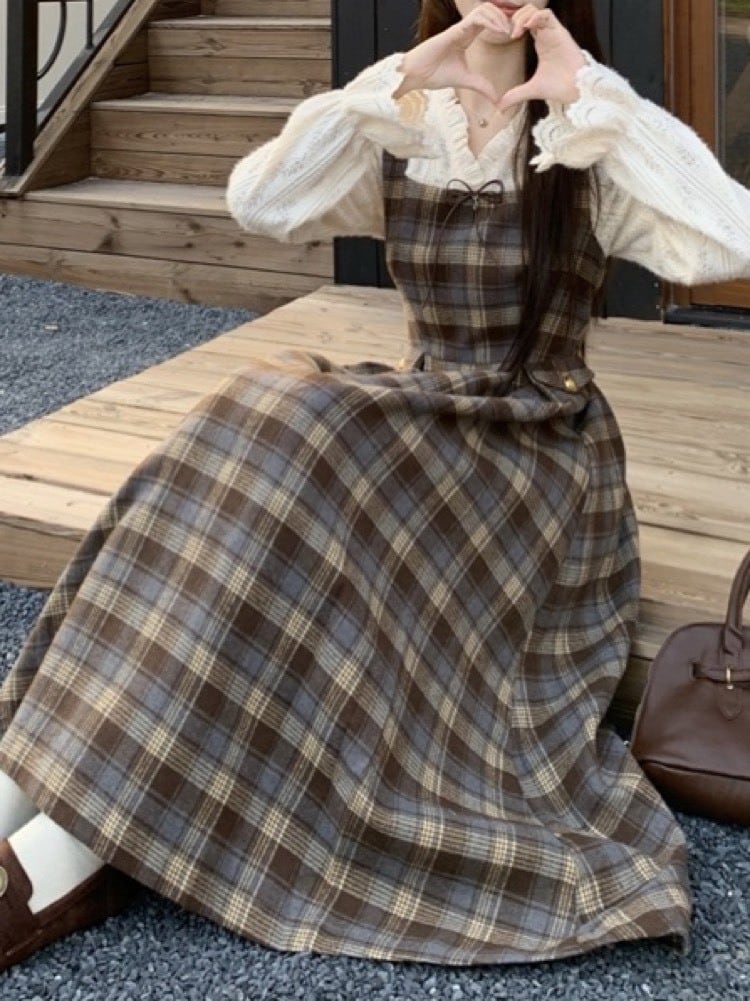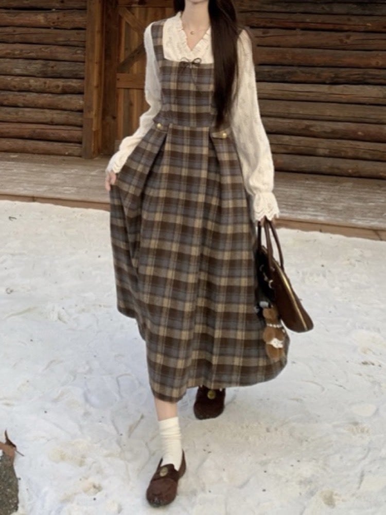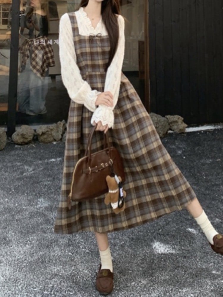 毎日でも手に取りたくなる、やさしいブラウンチェックのジャンパースカート風ワンピース。