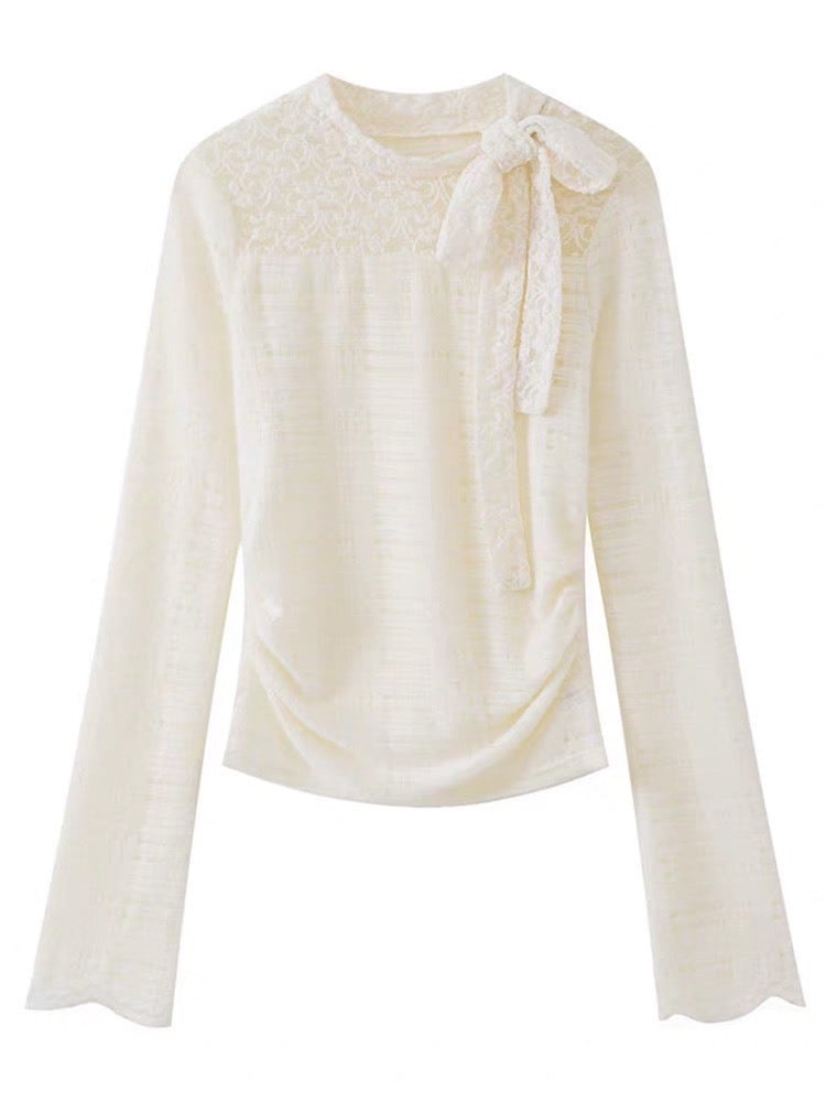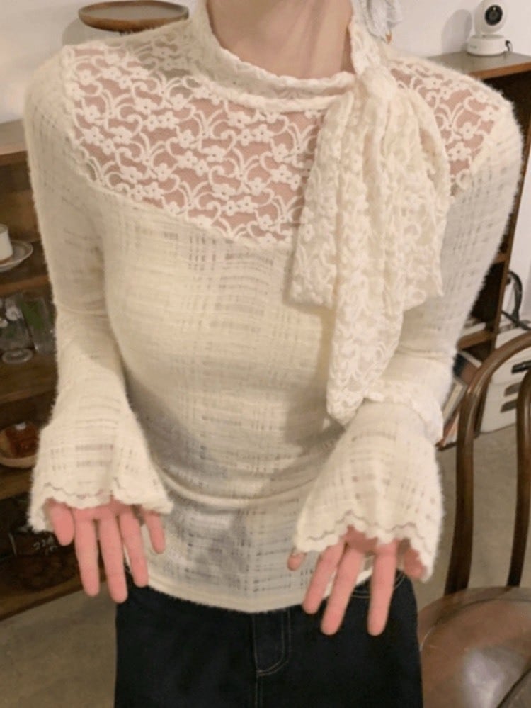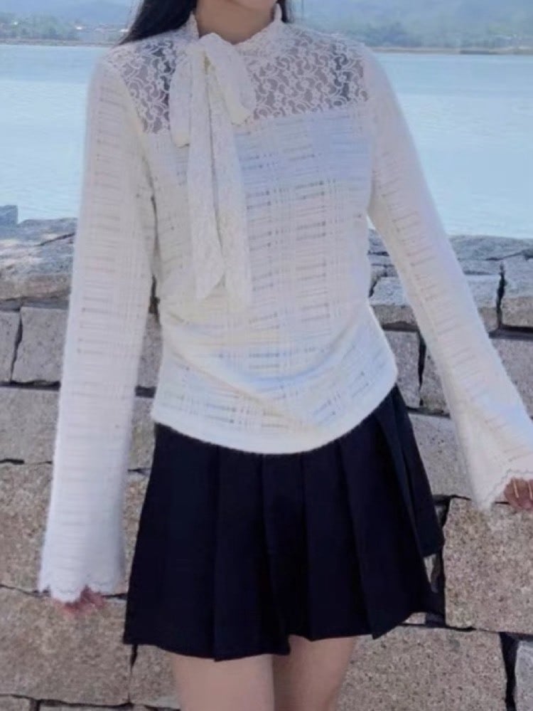 上品な色気を纏う レース×リボンホワイトニット 大人可愛い 着回し おしゃれ デート きれいめ 透け感 体型カバー 大きいサイズ 韓国 CH11273